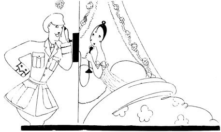 —where she is overcome with a sudden faintness, which disappears as soon as the perturbed uncle has given her a liqueur brandy. With commendable patriotism she has him arrested on the spot for treating, and