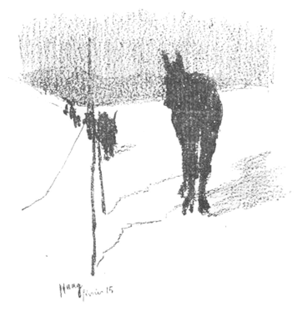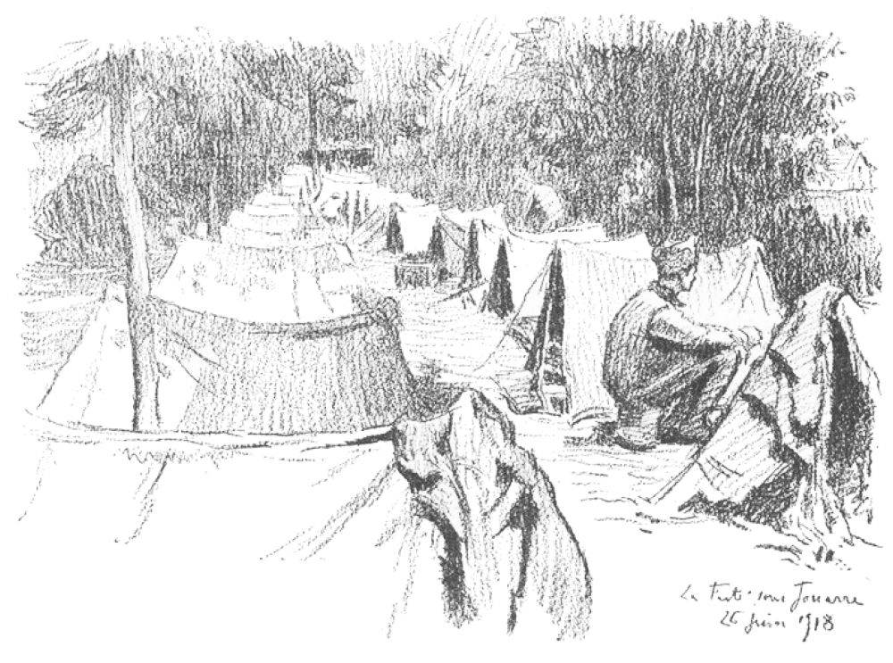 Cependant les sapins qui, jusqu’ici, m’avaient protégé de leur ombre majestueuse et bleue se font plus rares; aux taillis naturels succèdent des buissons de fil de fer barbelé. Des éclatements se précisent, plus rapprochés, plus nets... A un tournant, une intolérable odeur de bêtes en décomposition—des mulets ont été éventrés par une rafale «bien placée».
