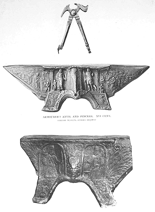 The subject of the Armourer and his Craft has never received much attention in England, even at the hands of Meyrick and Hewitt. On the Continent, however, writers like the late Dr. Wendelin Boeheim, Gurlitt, Buff, and Angellucci have all added greatly to our store of information on the subject. Boeheim’s work on the Armourers of Europe (Meister der Waffenschmiedekunst) is the only work in any language which has given us some account of the armour craftsmen of the fifteenth and sixteenth centuries, and I should be indeed remiss if I did not take this opportunity of acknowledging the assistance which this collection of biographies has been in the preparation of the present work. Signori Gelli and Moretti have collected interesting documents relating to the Missaglia family, but apart from this no other writers have made a study of the Armourer.