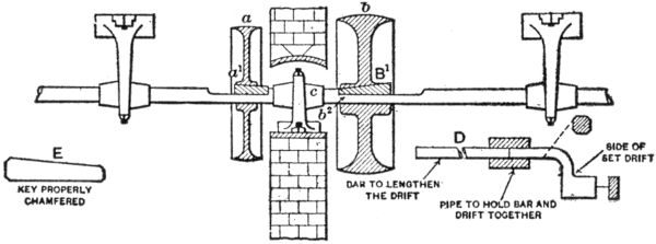 Ultimately one of us had to get into pulley b, and, removing cap c, hold the improvised side offset, long, starting drift D in place against B1 at b2 while the other swung the hand sledge at a. The entering end of the key, not having been file chamfered off, as it should have been (see E), our starting drift burred it up; so, after having started it, we had the pleasure of getting[Pg 5] into b to file the key end b2 into shape so as to admit of getting it out.