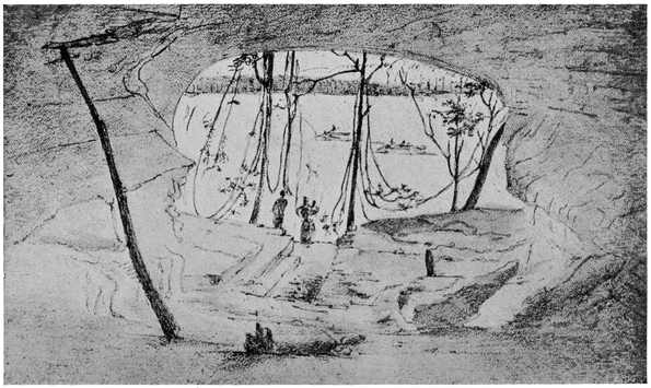 Such is Cave-in-Rock today, and such it was in pioneer times, except that in the rear a deposit of earth had not been washed in, and that large trees, which stood in front of the mouth and hid or partly concealed it, have long since disappeared. It was an ideal lair for river23 outlaws; it furnished shelter and gave them every advantage over passing travelers.