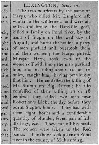 | Facsimile of News Item regarding Capture of Micajah Harpe | 123 |