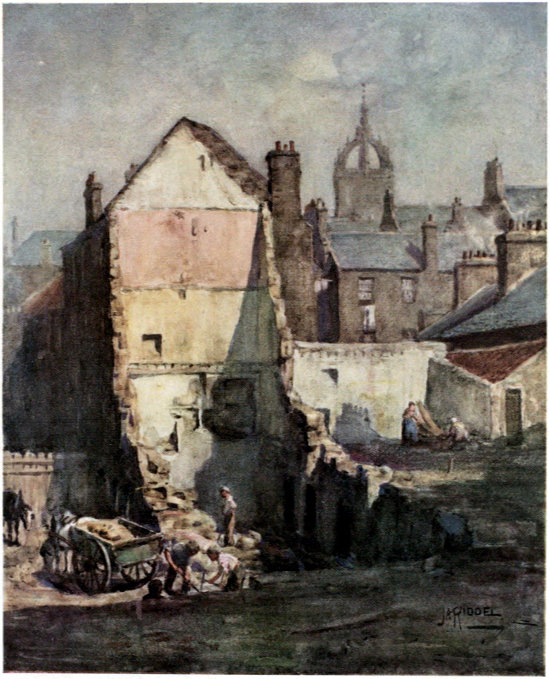 Falcon Hall on the south side of the town, with its great gardens and walled-in parks, has disappeared. So also has the interesting villa of Abbey Hill, occupied until very recent times by the Dowager Lady Menzies. The Clock Mill House adjoining Holyrood Palace and the Duke’s Walk, and surrounded by ancient trees, has gone, as have likewise the many fine old residences with pleasant gardens which adjoined the two main roads between Edinburgh and Leith. All have passed away, giving place to rows of semi-detached villas and endless lines of streets erected for the housing of an ever-increasing population.