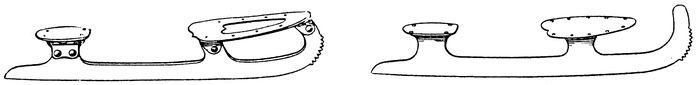 The proper skate has two stanchions or uprights running from the blade to the foot and heel plates. There seems to be scientific warrant for the statement that this method of construction makes it “run farther.” The old pattern having three stanchions or supports has been discarded by the best skaters of all skating countries for years.