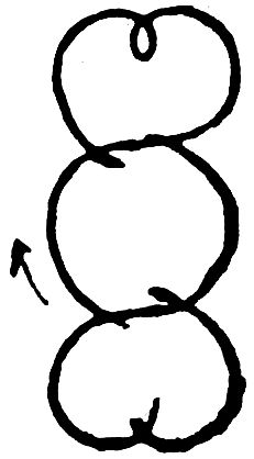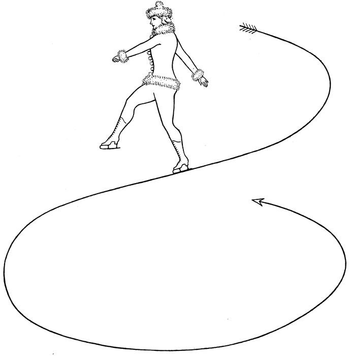 The fact that the balance leg, which was being carried behind the body, has now been brought in front of it, implies that a complete change in the balance of the body has taken place. Up to a little more than one-half of the circle the body has been held strongly forward; as the foot passes the skating leg the body assumes first a straight and then a slightly backward balance. The arms, too, have been serving to compensate the balance. At first they are held well toward the left or behind. As the body twists or turns into the new position and the shoulders are brought square with the direction of the print, the arms slowly swing forward and, from being held on the outside of the circle at the beginning of the stroke, are found on the inside of the circle at the end of the stroke.