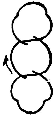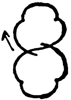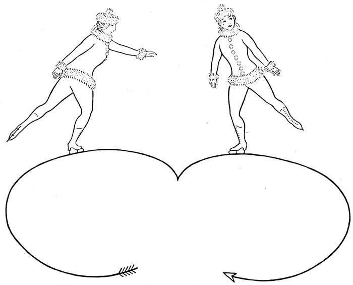One of the most agreeable and simple figures for pair skating is the “once-back.” Both partners skate this figure on the same foot and simultaneously. The gentleman stands to the lady’s left, her hands behind and to the left touching his. A bold, strong outside edge circle is started by each skater on the right foot. When one-third the circle has been skated a three is made and immediately an outside edge backward stroke on the other foot. Both partners are now going backward on left outside edges. When two-thirds of the circle has been skated a three on the left foot is made and the pair strike out on the right outside forward edges to the spot where the figure was begun. The gentleman’s arm should slightly support the partner at the three turns.