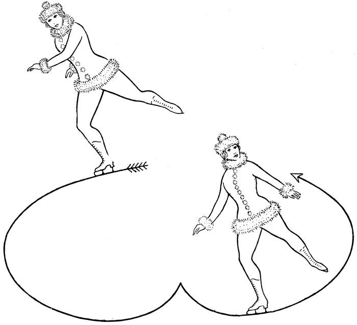 When some slight familiarity with this figure is attained then stand side by side, the forward skater’s left hand in the partner’s right. Strike out boldly on the right outside edge still touching hands, with intent to make a big circle. After about one-quarter of the circle has been skated let go of hands, continue skating the circle alone for one-half of its distance, which will bring the skater at the back across the circle being skated by the one in front and to the right side of the forward skater. Here, as about three-quarters of the full circle is skated, the forward skater’s right hand will be caught by the partner’s left hand and the figure finished in that position. This is very simple, very graceful and very effective. It should be skated in the form of an eight and each full stroke will then bring the skater back to starting point. It has the advantage of interfering less with the correct balance of the skaters and the correct carriage of the arms than the former figure. The better skater of the two should skate behind. The forward skater should pay very little attention to the partner, all the matching of stroke and the catching of hands being attended to by the partner behind.