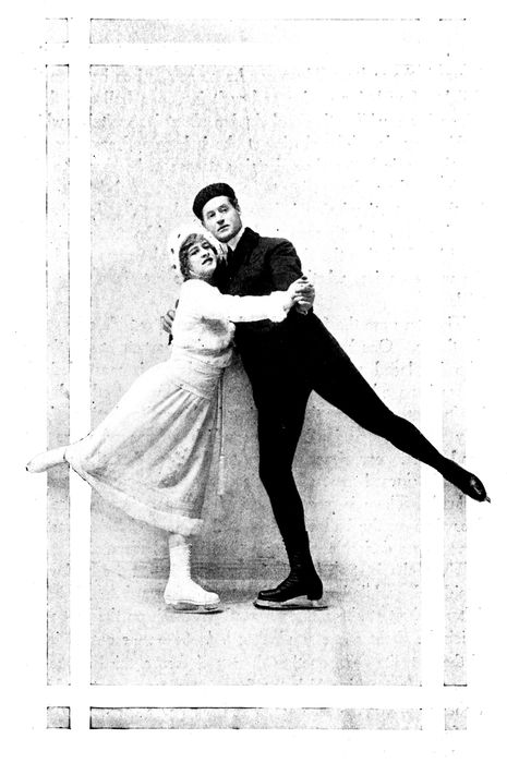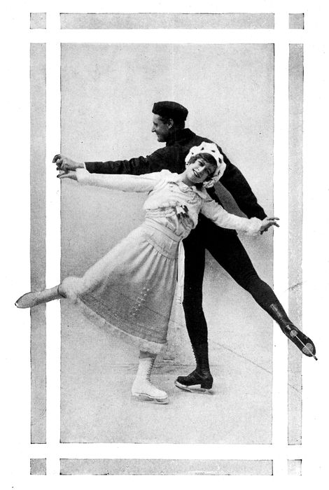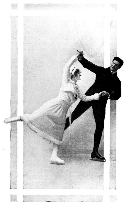 Many other delightful features are characteristic of pair skating. It is the sociable form of skating, As in dancing, where few are expert enough to do solo dancing, thousands enjoy dancing with a partner. There is stimulus to individual achievement in skating with a partner. Weak figures are aided in their development by encouragement and the helping hand. Rivalry results and helps toward progress. The mere presence of an assisting hand will often aid the ambitious skater in the first mastery of a difficult balance or the sustaining of a long spiral. Individual skating, when it is highly perfected, tends somewhat toward an over-abundance of dance steps and toe movements, while pair skating remains skating at its best—the long, sweeping, exquisitely poised curves carried over two hundred feet of glistening ice.
