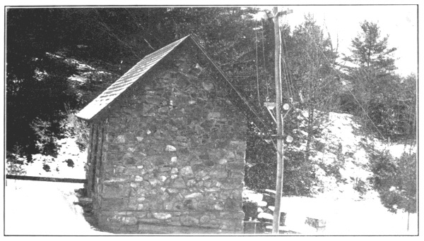 The power house is situated about 1700 feet from the house, where the electric current was most wanted. This necessitated the construction of a transmission line. For this purpose a double line of bare aluminum wire was stretched on a row of poles about twenty feet high and about one hundred feet apart. The poles are provided with ordinary crossarms at the top on which are mounted the insulators carrying the wires. As the transmission line leaves the power house it crosses a highway and runs in a perfectly straight line to the house. Over the highway insulated wires were used as a safety precaution, but bare aluminum wire was used for the remainder because it was cheaper.