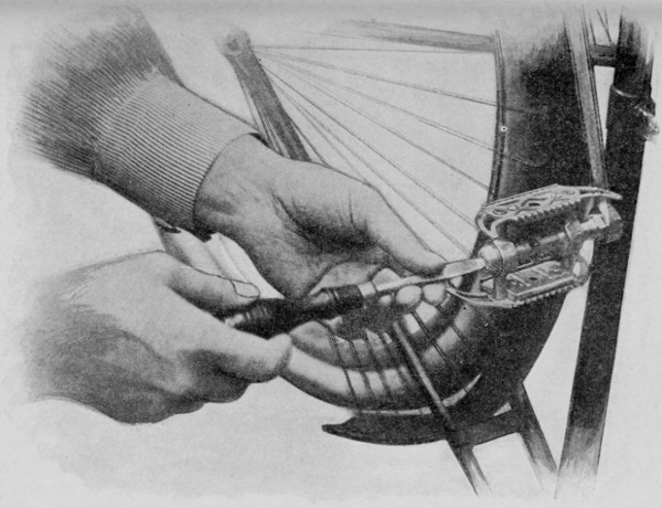 Next attend to gear. Find if with comfort you could exert more pressure on the pedals. If so, have[169] the gear increased. If there is cramp in the foot, or the foot feels strained, have the length of crank changed. If the foot is long in proportion to the other lever lengths, lengthen the crank to permit of freer instep play; or have it shortened to relieve a strained feeling in the foot. The crank length may be changed to relieve either cramp or strain in the leg and thigh until the pressure and length are arranged to suit the natural step or pace.