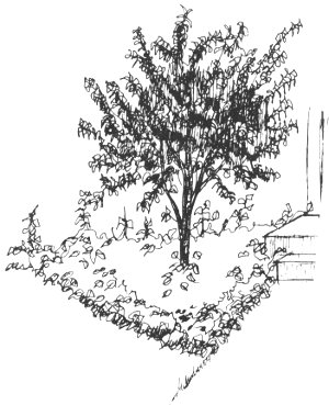 Use small ornamental trees to add a softer appearance to wall corners. Place these trees far enough away from the house that the branches will not rub against it when the tree is fully grown. Place low facer plants in front of the taller shrubs to give the corner planting more depth.