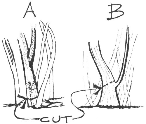 When removal of a cane has been decided upon, make the cut as close to the ground as possible (example A). When an old cane selected for removal has a desirable shoot at its base, make a cut as shown in example B. Note that the cut is slanted and is approximately ¼ inch above the shoot.