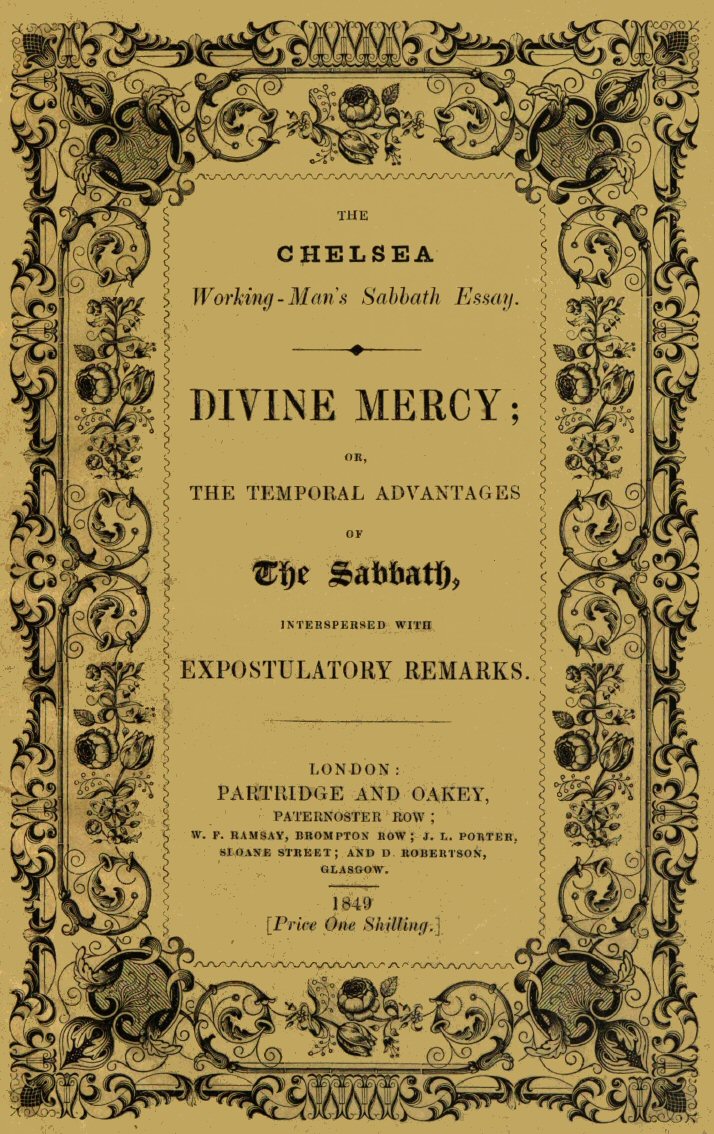 One month had elapsed before I was informed of the original intention, and at that period the health of my wife was in a very precarious state, besides which I was myself labouring under great distress of mind. Notwithstanding these evident disadvantages, the subject being congenial to my feelings, I resolved on making an effort to express my individual views respecting the temporal value and importance of the Sabbath-day.