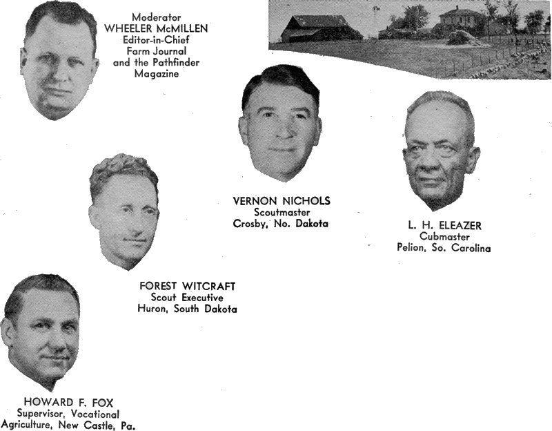 To help bring this rural business into the spotlight, SCOUTING Magazine asked eight men to join in one of our Round Table discussions. These men represent all phases of rural life and of Scouting. The “moderator’s gavel” will be wielded by the Chairman of our National Committee on Rural Scouting, Wheeler McMillen, who as the Editor-in-chief of the Farm Journal and the Pathfinder Magazine, has a host of friends throughout America.