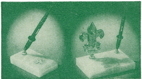 Fine pens, swivel-mounted on handsome bases of heavy polished onyx. 14kt. gold points. Brass inscription plates on all but single model. Practical gifts for boys and leaders! Expertly made of heavy plated metal.