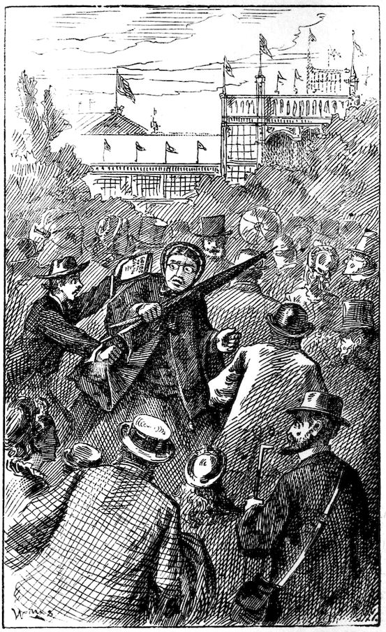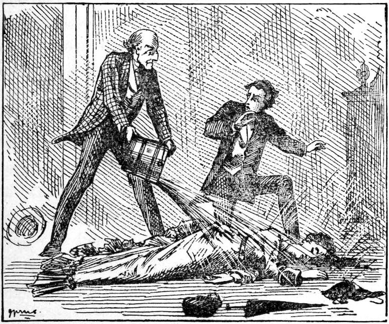 You see the way on’t was, Tirzah Ann—not bein’ used to travellin’—got lost. Whitfield left her a minute on the platform to go back after her parasol, and she heerd ’em say “All aboard,” and she thought she must git on that minute or die. He, seein’ she was gone, thought she had went back after him, and he went searchin’ after her. The train went on; he took the next train up, and she the next train down, and they passed each other; and then she took the next train up, and he the next train down, and they missed each other again. And so they kep’ it up all the first day and night. Finally, the next mornin’ the conductor—bein’ a old gentleman, and good hearted—telegraphed to Whitfield that he would be to the upper depot at 10 o’clock, and told him to come on instantly and claim his property and pay charges, or it would 563spile on his hands. I s’pose she did take on awfully, not bein’ used to trouble; she fainted dead away when Whitfield come on and claimed her and paid charges; and the old gentleman bein’ crazy with trouble deluged a mop-pail full of water onto her, and spilte every rag of her clothes, bunnet and all. Thirty dollars wouldn’t have made her whole; I s’pose she looked like a banty hen after a rain storm.