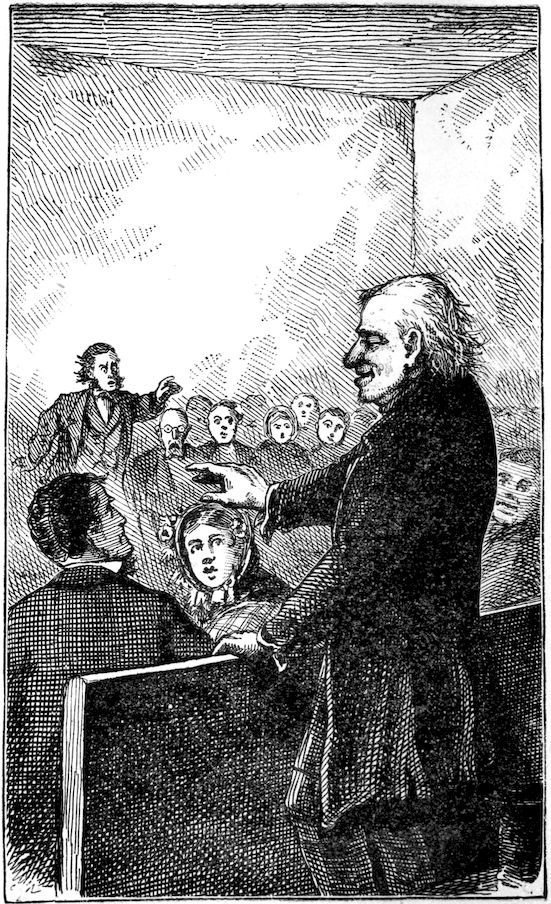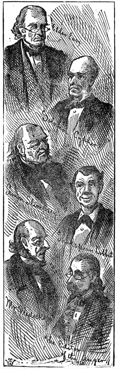 Judge Snow come jest as we was a settin’ down to the table. He seemed to be in awful good spirits, kep’ a jokin’ all supper time, and thinks’es I to myself, “You must feel different from what I do, if you can face the idee of your child’s goin’ west with such highlarity and mirth.” But truly, I wronged him; truly a shock was in store for us all; for as we got up from the supper table and went back into the settin’room, he stood up and says he in a deep noble voice: (they say his voice sounds a good deal nobler, and deeper, sense he got to be a Judge,)