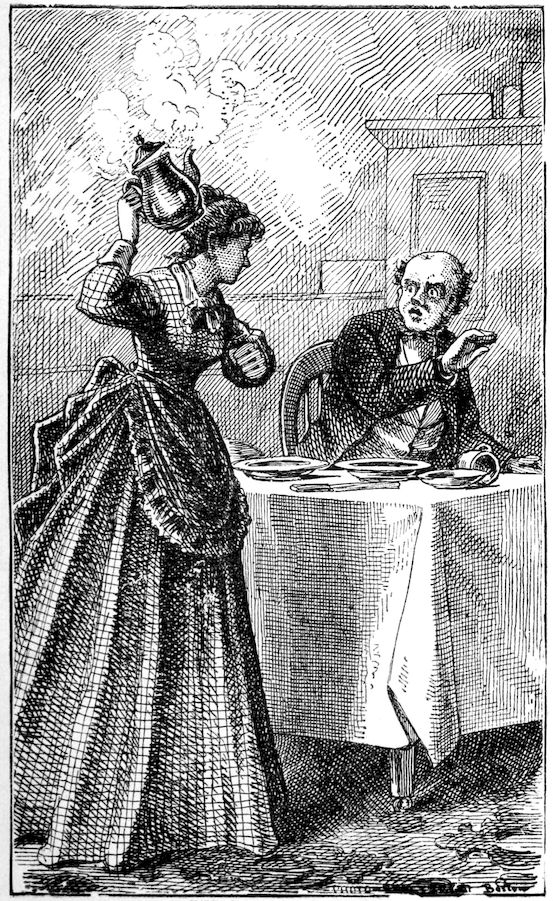 The mornin’ of the fourteenth of September dawned fair and peacefully. The sun rose up considerable early in the mornin’, and looked down with a calm and serene face upon Jonesville and the earth. And not fur from the same time, I too, rose up and with as calm and serene a face as hisen, I went to work and got a excellent breakfast for my Josiah and me. It was the day we had looked forred to for a year. The deed that was to give our Tirzah Ann and her pardner a handsome home lay in security in the depths of my Josiah’s vest pocket, and in the buttery was a big basket full of as good vittles as was ever baked by woman—enough to last ’em a week. The new carpets and housen stuff had been privately carried into the house, unbeknown to them; and that very afternoon was the time we was a goin’ to make ’em almost perfectly happy. Oh! how serene and noble I felt as I poured out my dish-water and washed my breakfast dishes.