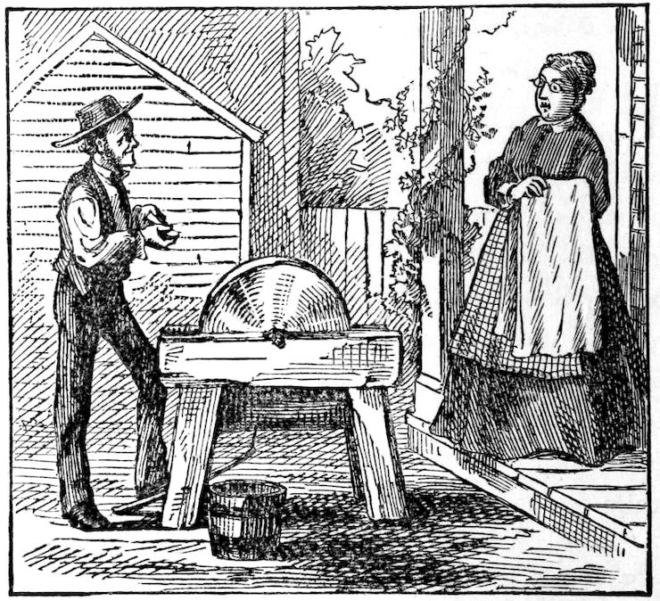 “How long will it take your pardner, Josiah Allen, to make a mess of cream biscuit, and broil some of that nice steak we jest got to Jonesville, and mash up some potatoes? And you know,” says I in the same gentle axents, “there is good butter and cheese and honey and canned peaches and everything right in the suller.”