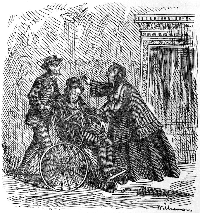 Well she said she enjoyed real poor health; she had got the shingles the worst kind, and a swelled neck, 560and the newraligy, and the ganders, and says she, “Havin’ to support a big family in this condition makes it hard for me.”