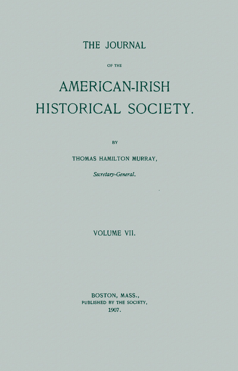 I take great pleasure in here presenting Volume VII of the Journal of the American-Irish Historical Society. It is hoped the book will be found equal, in point of general interest, to those preceding it and helpful to the organization to whose labors and progress it is devoted. The Society continues in a prosperous condition, has no indebtedness, and is steadily adding new members to its roll. The historical papers contained in this work will be recognized as of more than usual value, while the historical notes and other material will, we are confident, be likewise fully appreciated.