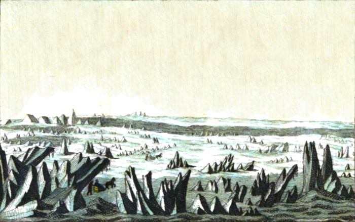 Difficilmente può figurarsi la tristezza che infonde la solitudine di quell’immenso campo di ghiaccio. In sì vasto spazio niun essere vivente si presentò a’ nostri sguardi; non uomo, non quadrupede, non volatile: ivi la natura era morta. Che abbandono! che isolamento! che silenzio! Qualche volta venti in contrasto tra loro cozzando impetuosi su quelle rupi gelate, mettevano un fischio profondo, che propagavasi nello spazio, e vi si estingueva: qualche volta l’aria condensata in quelle masse gelate si apriva violenta una strada, e le spezzava con orribil rimbombo, che in un momento rompeva il cupo silenzio spaventosamente, e in un momento quel silenzio repristinavasi, e diventava più terribile. A tante cagioni di malinconia che opprimeva l’anima, a tanti pericoli che ad ogni passo moltiplicavansi, bisogna aggiungere l’incontro frequente di profonde crepature, che presentano all’occhio l’abisso delle acque coperte di ghiacci. Desolante [28] è l’apparizione di quelle crepature, massimamente perchè non aspettate; e talune obbligano a fare un ponte di tavole per valicarle.