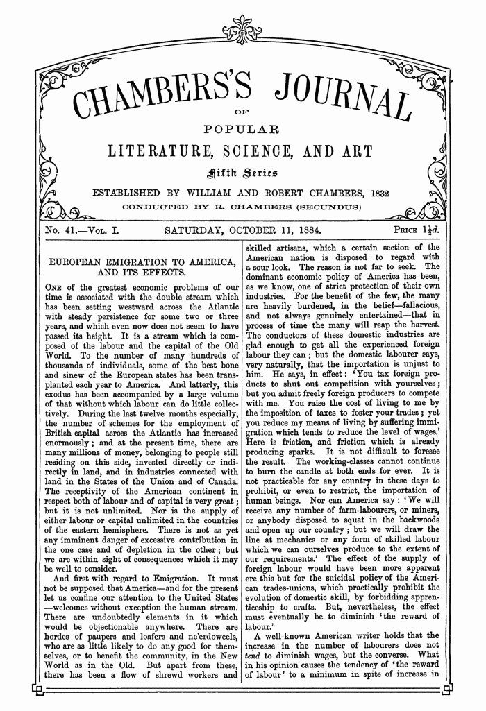 Title: Chambers's Journal of Popular Literature, Science, and Art, Fifth Series, No. 41, Vol. I, October 11, 1884