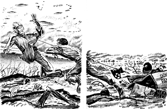 Trace gave him a look that in its time had crackled the enamel on the teeth of many a GI. He said slowly, "My name is Sergeant Roscoe and I am your commanding officer and you had better remember it, Mac, or you will have cause to wish you had become extinct some years before you ever laid eyes on me. Now I shall continue. The fleet of enemy ships left here at a terrific pace between one and two o'clock this afternoon, heading in the direction of Washington, D.C. I haven't spotted one since. Therefore what we will do is pick up our flat feet and head for the capital. God knows what we'll find there, but it's a cinch we've got to get out of here plenty fast."