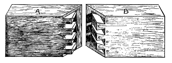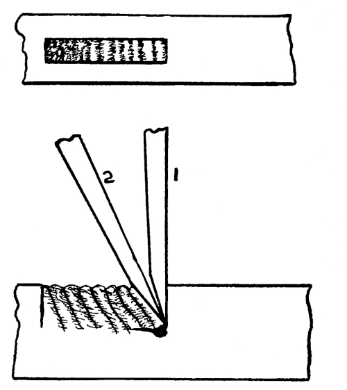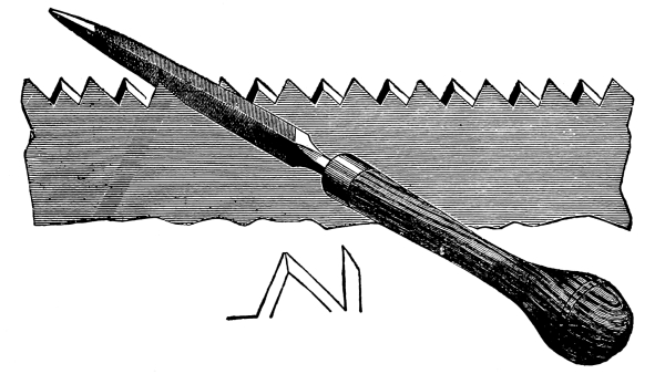 The teeth of a hand-saw should be filed so true that on holding it up to the eye and looking along its edge, it will show a central groove down which a fine needle will slide freely the entire length. This groove must be angular in shape and equal on each side, or the saw is not filed properly and will not run true.