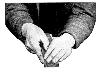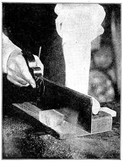 In all cases where ripping is done, the thrust of a saw should be on an angle of about 45 degrees to the material being cut, as shown in Fig. 4. [Pg 12] This makes a shearing cut, an advantage that can be quickly demonstrated with an ordinary pocket knife, cutting any piece of soft wood.