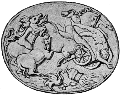 But nothing serious happened until one time Phaeton persuaded father to let him drive the sun chariot for a day. The horses, feeling at once a new and weak hand on the reins, tore out of the regular road and went dashing right and left. They even got so near the North Pole that the ice began to melt. They fairly flew down toward the earth, set the mountains smoking, and dried up all the springs and most of the rivers.