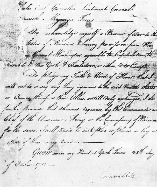 Following the surrender, Cornwallis, as a prisoner of war, gave his parole not to engage in further hostilities against the United States, or its allies, until exchanged and was permitted to go to New York. The original document is in the Virginia State Library.