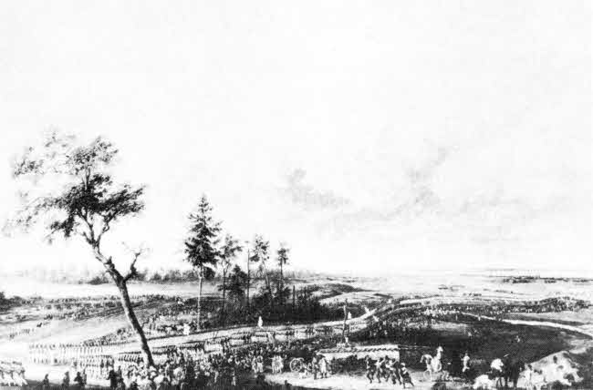 Reproduced from a picture by Van Blarenberghe, based on an action sketch. The foreground shows allied staff officers in consultation over a map. Nearby, French troops are moving up to the front. In the background the batteries of the second parallel are in full play against Yorktown.