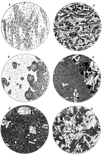 1. Vitreous Rock. 2. Semi-Vitreous Rock. 3. Vitreous Rock with Sphærulites. 4. Rock with Crypto-crystalline Base. 5. Rock with Micro-crystalline Base. 6. Rock of Granite Structure built up entirely of Crystals.