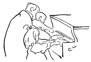 Allerdings. Doch laßt mich jetzt, bevor ich diese Zeilen schließe, auch noch ein paar ernste Worte hinzufügen. Daß diese Bilder mit Motiven aus meinem Heim in die Welt verstreut werden, macht wenigstens mich selbst froh. Es liegt darin etwas von dem „Hinausgehen und allen Völkern predigen“. Worüber? Über das Glück des Fünfzigjährigen? Glück? Ganzes Glück gibt es nicht! Der Schuh drückt stets irgendwo, und das ebenso gut bei denen, die viele Schuhe besitzen als bei denen, welche gar keine haben. Aber die Kinder — und von ihnen handelt eigentlich dieses Buch — sind die Träger unserer Hoffnungen und unserer Sehnsucht. Diese sind ebenso wie Du und ich tot geboren. Und doch: ihre rosigen Wangen und dicken krummen Beinchen, ihr fröhliches Geplapper, ihre bitteren Puppen- und Schularbeitssorgen, ihre verdrehte Ausdrucksweise, ihr Appetit, all’, all’ dieses erregt unser Entzücken, wir lachen, bis uns die Tränen an den von des Lebens Sorge durchfurchten Wangen herunterrollen, und wir drücken sie fast tot, diese Kleinen und danken Gott, daß er sie uns gab, denn wenn wir einst fort sind, dann — zum Kuckuck! — sind diese noch da! Schließet sie, diese meine Kleinen, in Eure Arme, Ihr seid es mir schuldig, denn Eure Kleinen sind mir fast ebenso lieb, wie meine eigenen. Ihnen gehört das Himmelreich! Sowohl Deinen wie meinen Kindern!