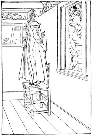 So, jetzt wurde ich der Kleinen habhaft und zufällig gerieten wir vor den Spiegel. Welch’ ein Motiv! Ohne Brita erst los zu lassen, ordnete ich eine Staffelei, langte mir ein Papier und ergriff eine Feder.