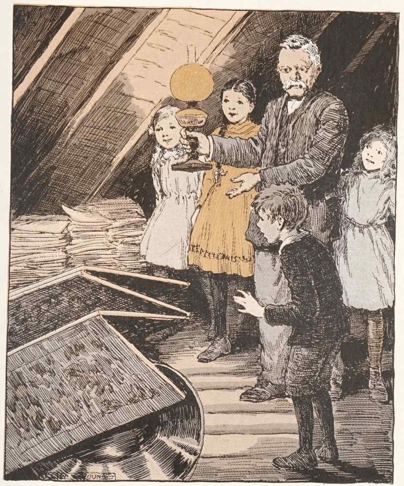 For the moment, I couldn’t think of anything to do there but slide down the banisters. You know what jolly fun that is, sliding so frightfully fast, especially where the banister curves. I went ahead up the stairs, the four boys after me, away up to the attic, then whizz! down the banisters! The whole troop tramped up the stairs again, whizz! down again. My! this was getting to be great fun—there stood Great-Aunt at the door.