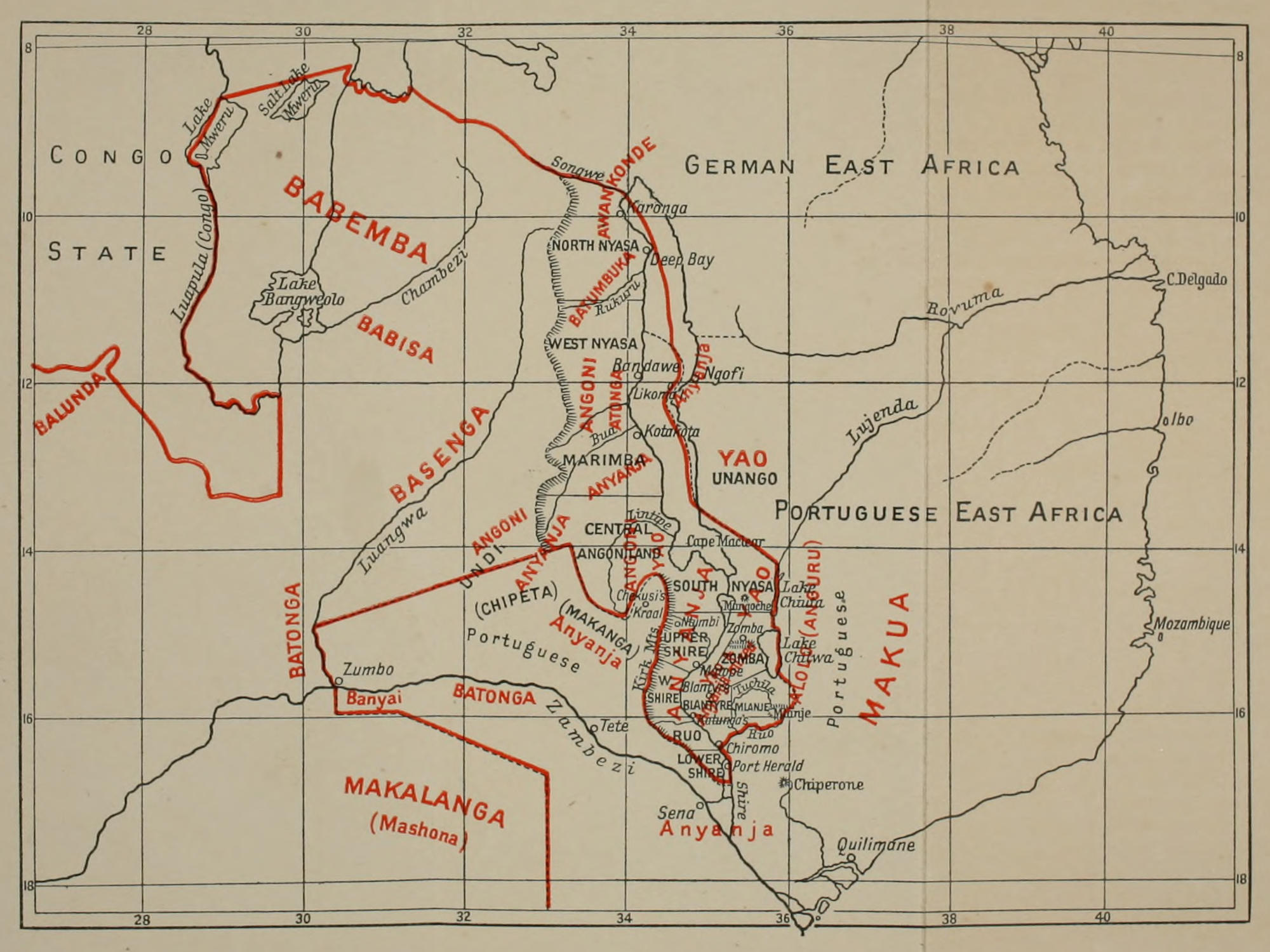 The last of these raids took place in 1884, but was brought to a peaceable conclusion. The Rev. D. C. Scott, accompanied by Mrs. Scott and Dr. Peden, visited Chekusi’s kraal and succeeded in coming to a[285] friendly understanding with that chief; and thenceforth the only Angoni hosts to cross the river were gangs of porters, or of men seeking work on the plantations. Chekusi died subsequent to the proclamation of the British Protectorate in 1891; his son was executed by the British administration after the ‘rising’ of 1896; and Mandala, whose village, after the delimitation of 1901 was found to be in Portuguese territory, was taken prisoner and died on the march to Tete. Mpezeni’s son and successor is a minor, and Mombera has been succeeded by a chief who has but little real authority, so that the prestige of these Zulu clans is now a thing of the past.
