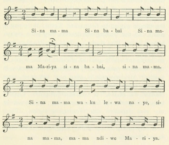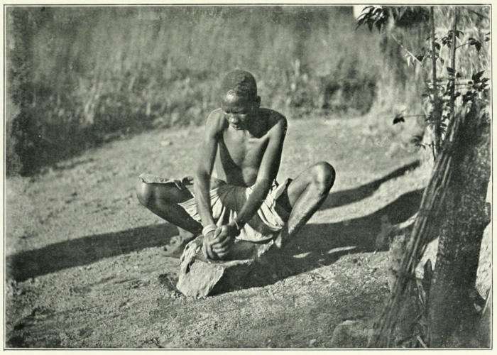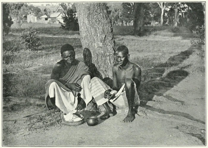The owner has the power of life and death over his slaves, but subject to the moral restraint already mentioned. Slaves may be beaten—sometimes cruelly—or confined in gori-sticks, at the will of their masters, but as a rule they are kindly treated, and, in fact, to an outsider, are often indistinguishable from the family. In speaking of or to them, the master says mwana (‘child’), or mnyamata (‘boy’), rather than kapolo (‘slave’). Some of the families at Nziza and Ntumbi had Yao slaves who must have been captured in the raids across the Shiré a few years before, and who seemed quite contented with their lot.