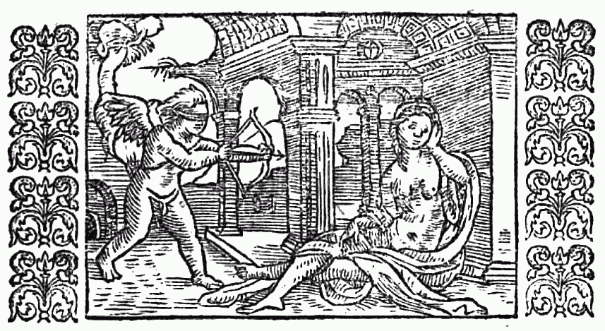 Moy estant ainsi vaincu, lié & conclavé, je commençay a mediter & rememorer les amours de plusieurs : lesquelz a telz embrasemens n’ont peu resister : & survint en ma pensee le pasteur Troyen, qui tant a son desadvantage veit Citharee. Puis comparut en ma memoyre le fort Achilles lequel estoit invulnerable, parce que sa mere la deesse Thetis l’avoit plongé en l’ung des fleuves infernaulx, appellé Styx. Mais pour ce ne peult evader qu’il ne feust attainct de la doree sagette de Cupido. Apres me vint souvenir de plusieurs aultres, comme Hannibal, Certorius, Demetrius, & Philippe de Macedoine. Apres je consideray avecq quelle force amour a superé Aristote, Platon & Virgile, lesquelz nonobstant leurs sciences ont esté subjuguez de l’invincible puissance D’amours.