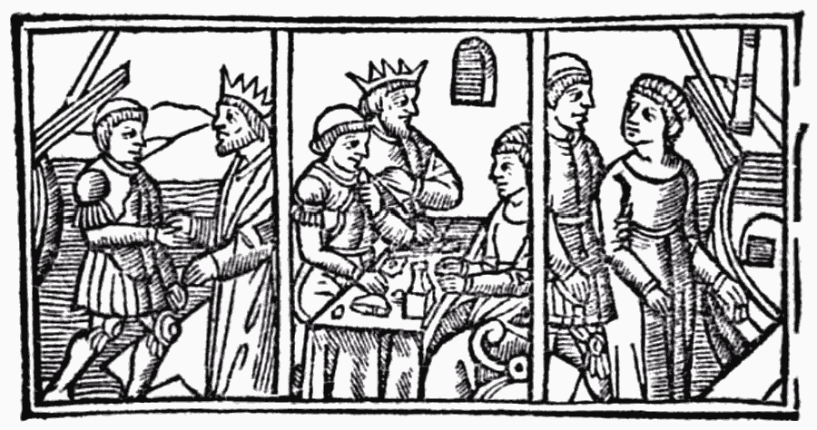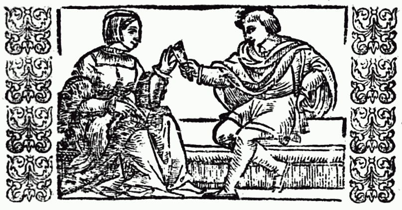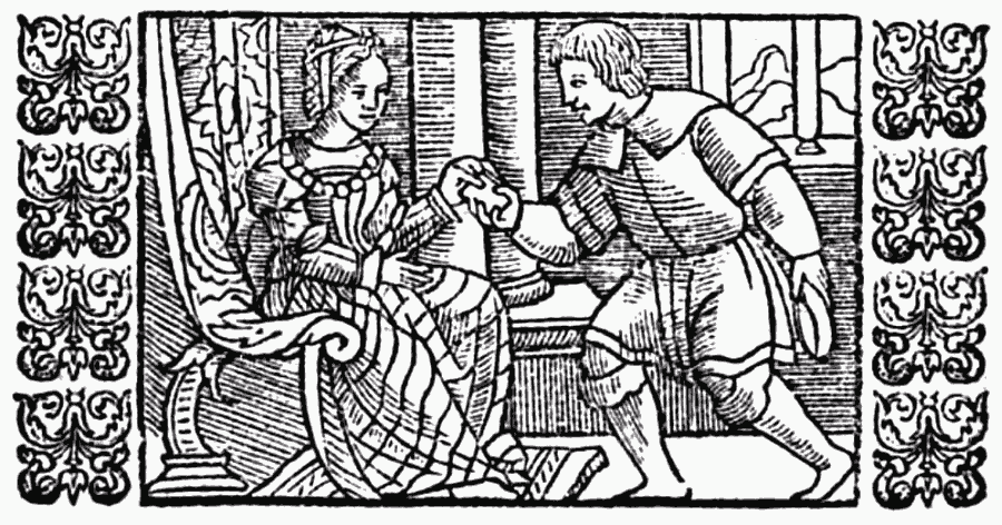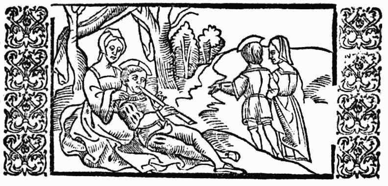 Long seroit a racompter & difficile, les pensemens que j’avoye : car je croy veritablement que jamais amoureuse ne fut si cruellement traictee en amours. Mais je m’esforceray d’en declarer, le plus qu’il me sera possible. Ainsi doncque perseveray journellement en telles amours tousjours usant des regardz acoustumez. Toutes ces choses veoit mon mary, comme cler voiant estoit certain que j’estoye surprinse, mais il ne m’en monstroit aulcun maulvais semblant. Mais au contraire, me monstroit plus grande amitié que jamais, dont je faisoye bien petit d’estime, car toute l’amour que luy portoys au paravant, s’estoit de luy separee, & en estoit le jeune amy vray possesseur. J’avois tant de plaisir en le regardant, que n’estimoye liesse qui la mienne superast, & ne cessay de penser & ymaginer, comment je pourroye parler a luy, & aulcunesfoys estoye si perturbee, que quant mon mary parloit a moy, je luy faisoye reiterer son propos par plusieurs fois, parce que l’appetist desordonné, avoit tout transporté mon esprit, au moyen de mes inutiles pensees. Je veoye mon amy quelques foys jouer d’une fleuste, aultres foys d’ung luc. Je prenoye singulier plaisir a l’ouyr, & a bref parler tous ces faictz m’estoient merveilleusement aggreables.