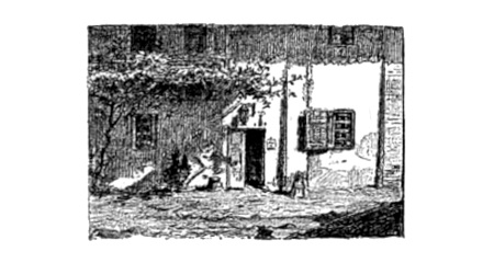 I due custodi, marito e moglie, sbucarono fuori dalla casetta rustica; l’uno si diede attorno a scaricar le nostre robe, l’altra andò per le chiavi, aprì larga la porta, salì le scale e comparve a spalancar successivamente ciascuna delle finestre per rinnovare l’aria, disperdere l’odore di rinchiuso, rinfrescare e spazzar dappertutto.