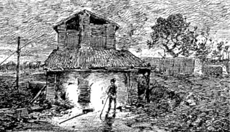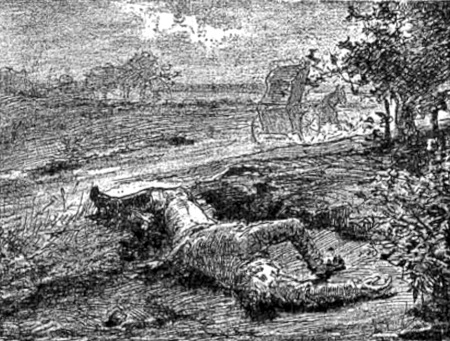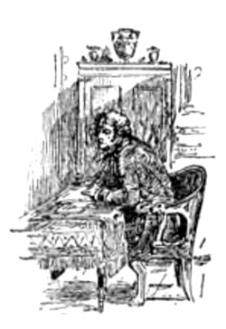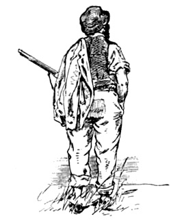 Di fianco al letto, appiccata al muro, una rastrelliera reggeva un fucile, due pistole a pietra, un gran carniere a reticella verde ed una mazza il cui pomo tornito con una certa combinazione di giri, rappresentava il profilo di Napoleone I.