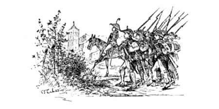 Subito il bosco parve animarsi e viver tutto: s’empì di guizzi di fiamma e di fumo; le palle grandinarono sul villaggio. Dalla terrazza del castello si cominciò a rispondere; [200] al basso ufficiali e sergenti cacciavano correndo comandi brevi ed acuti, per disporre gli uomini ai loro posti di battaglia.
