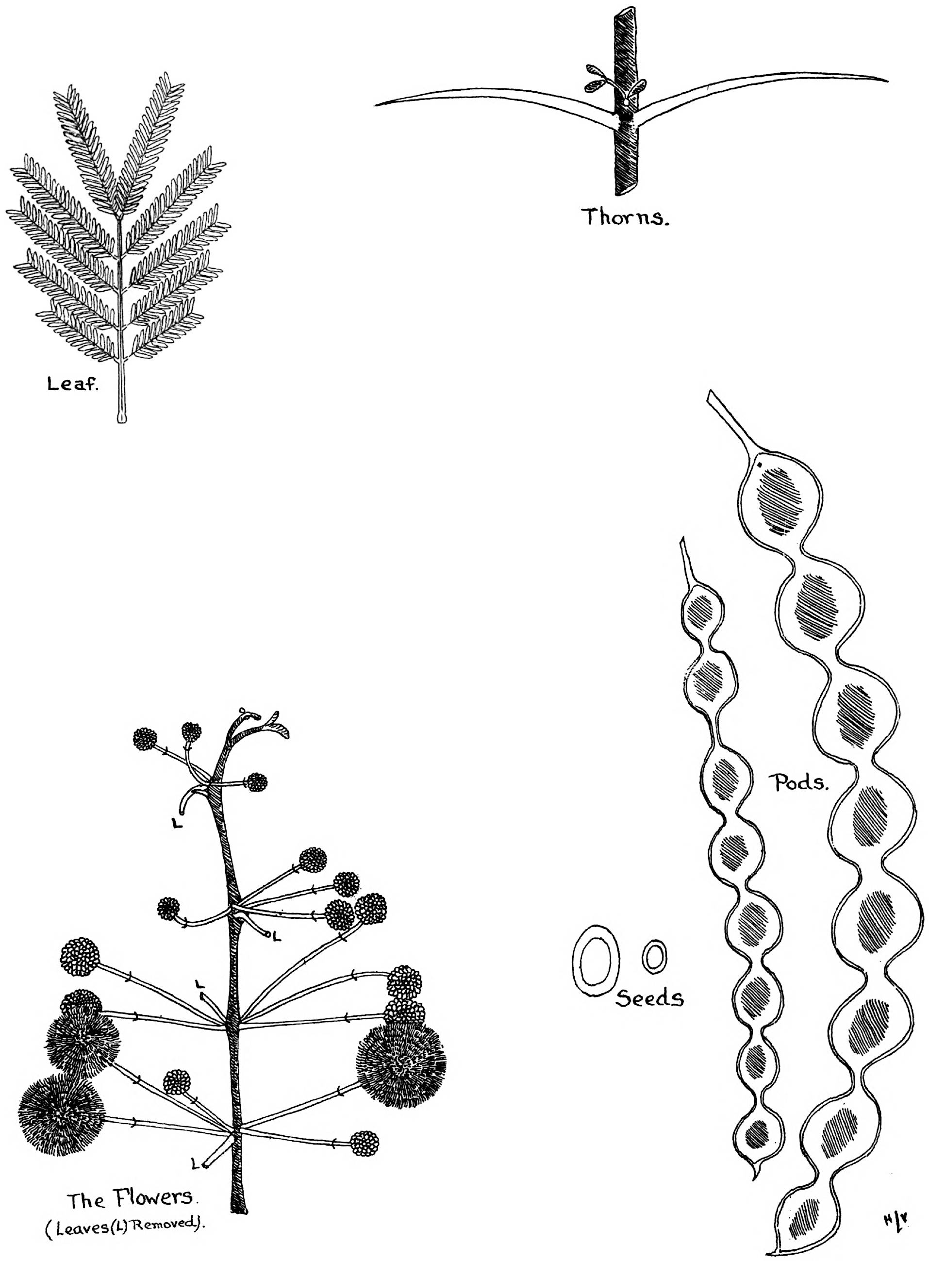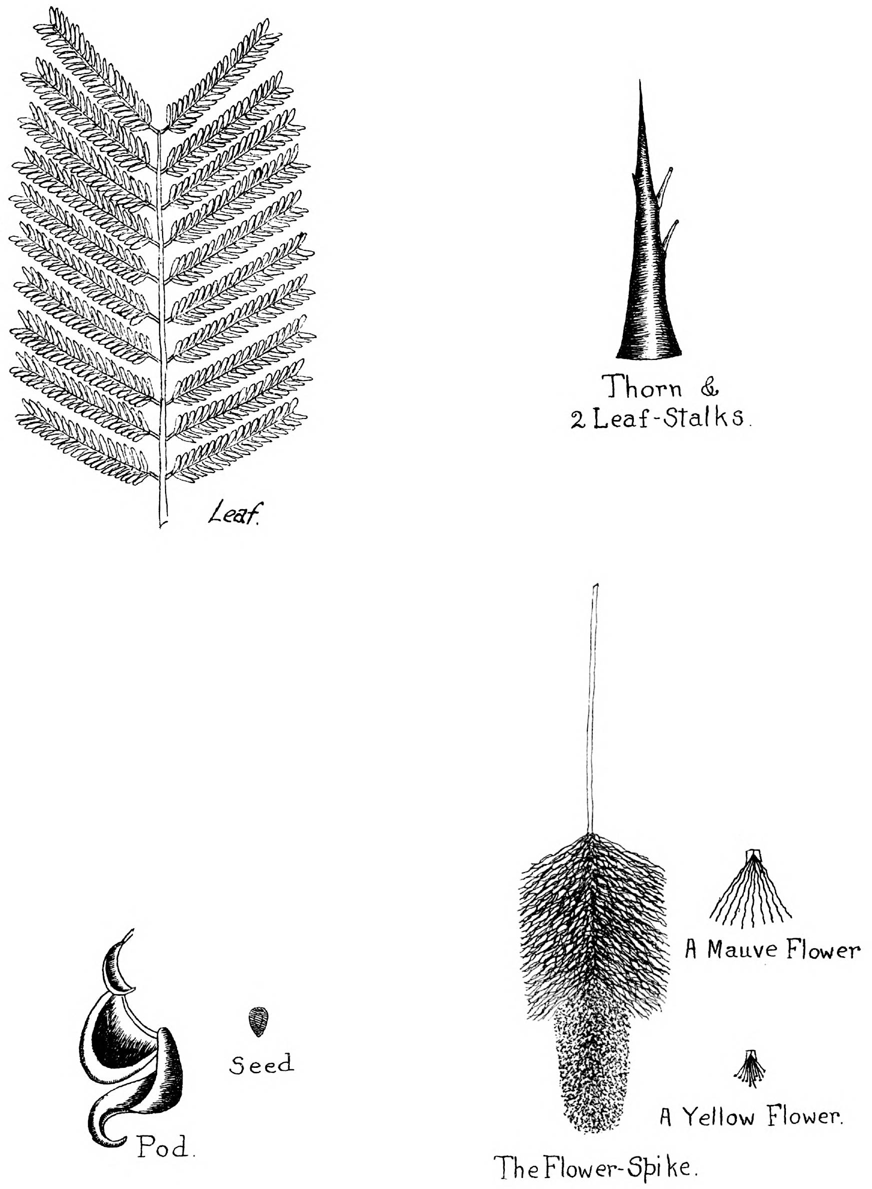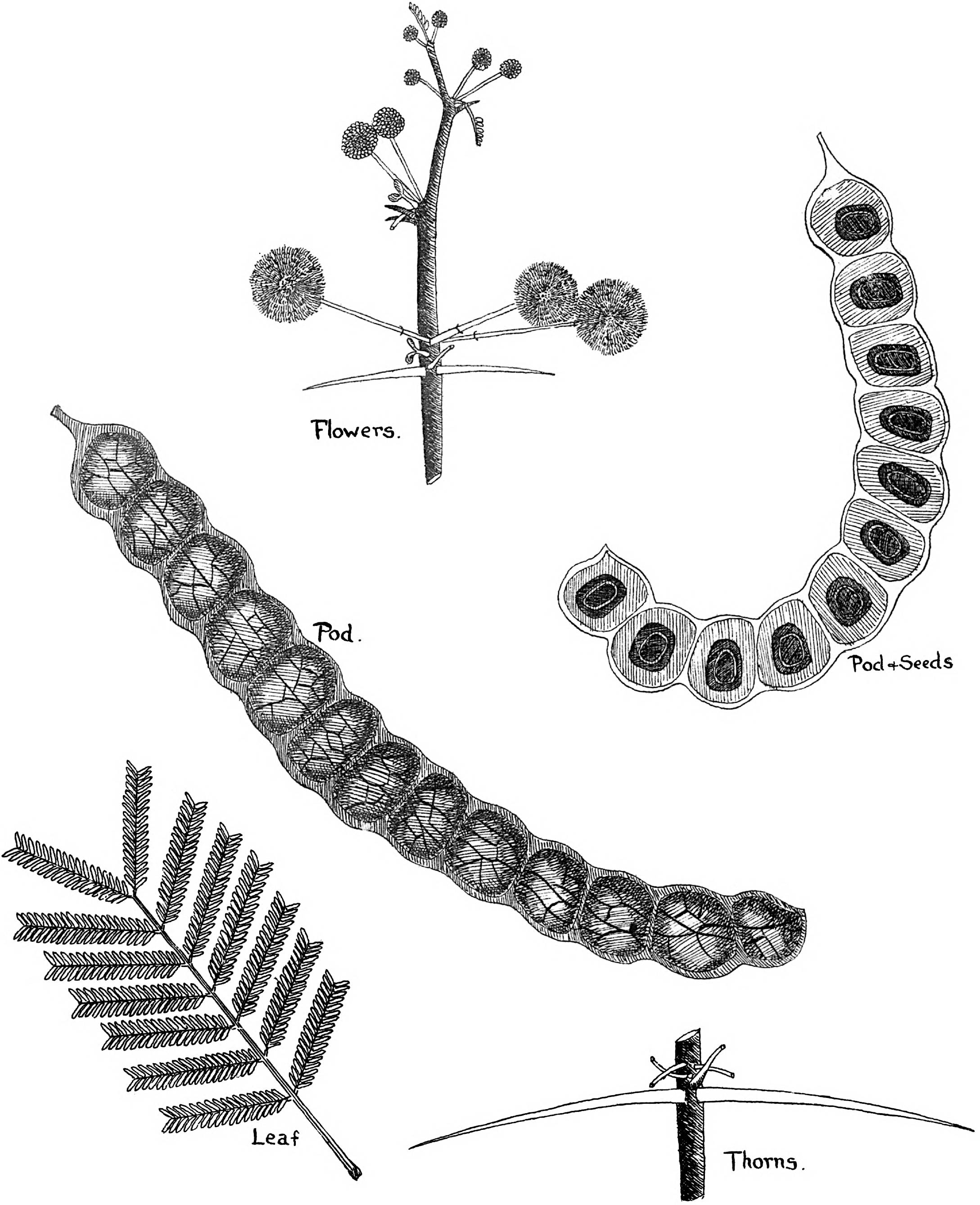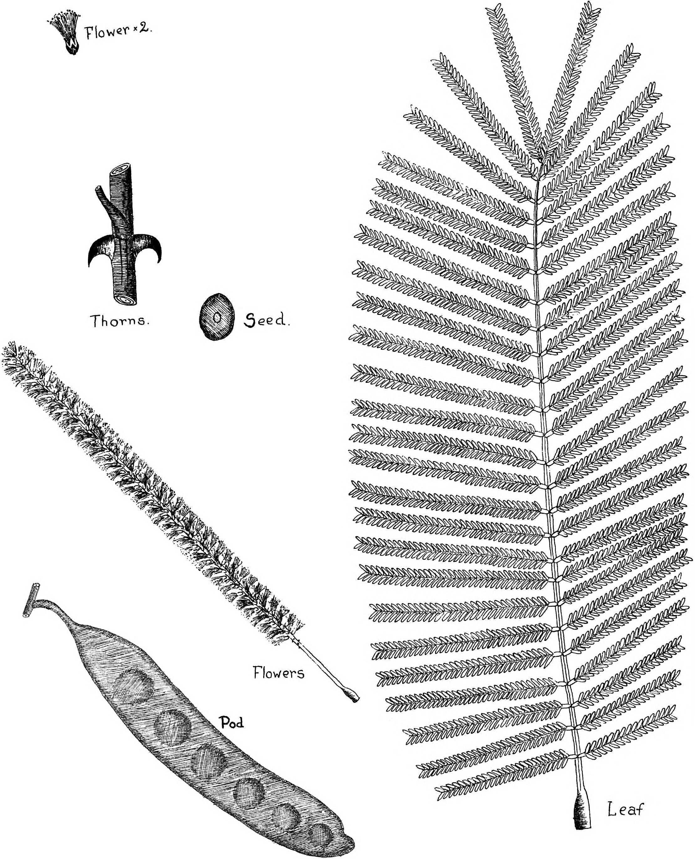 The Thorns, which are the readiest means of distinguishing this species from A. Sieberiana, are short, strong, recurved, and brown with a black point. They resemble falcons’ claws, from which they get their native name. They are in pairs at a widely obtuse angle.