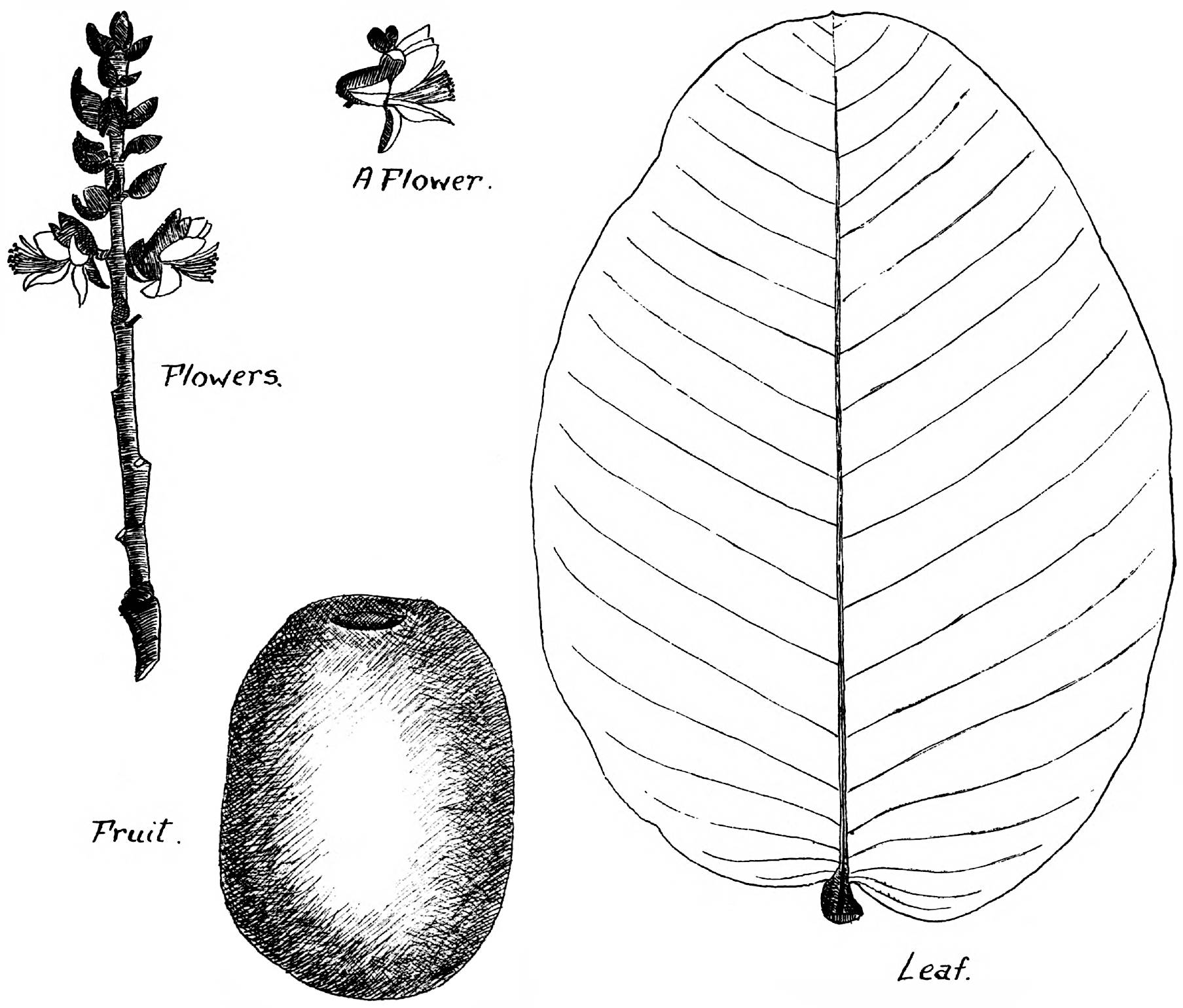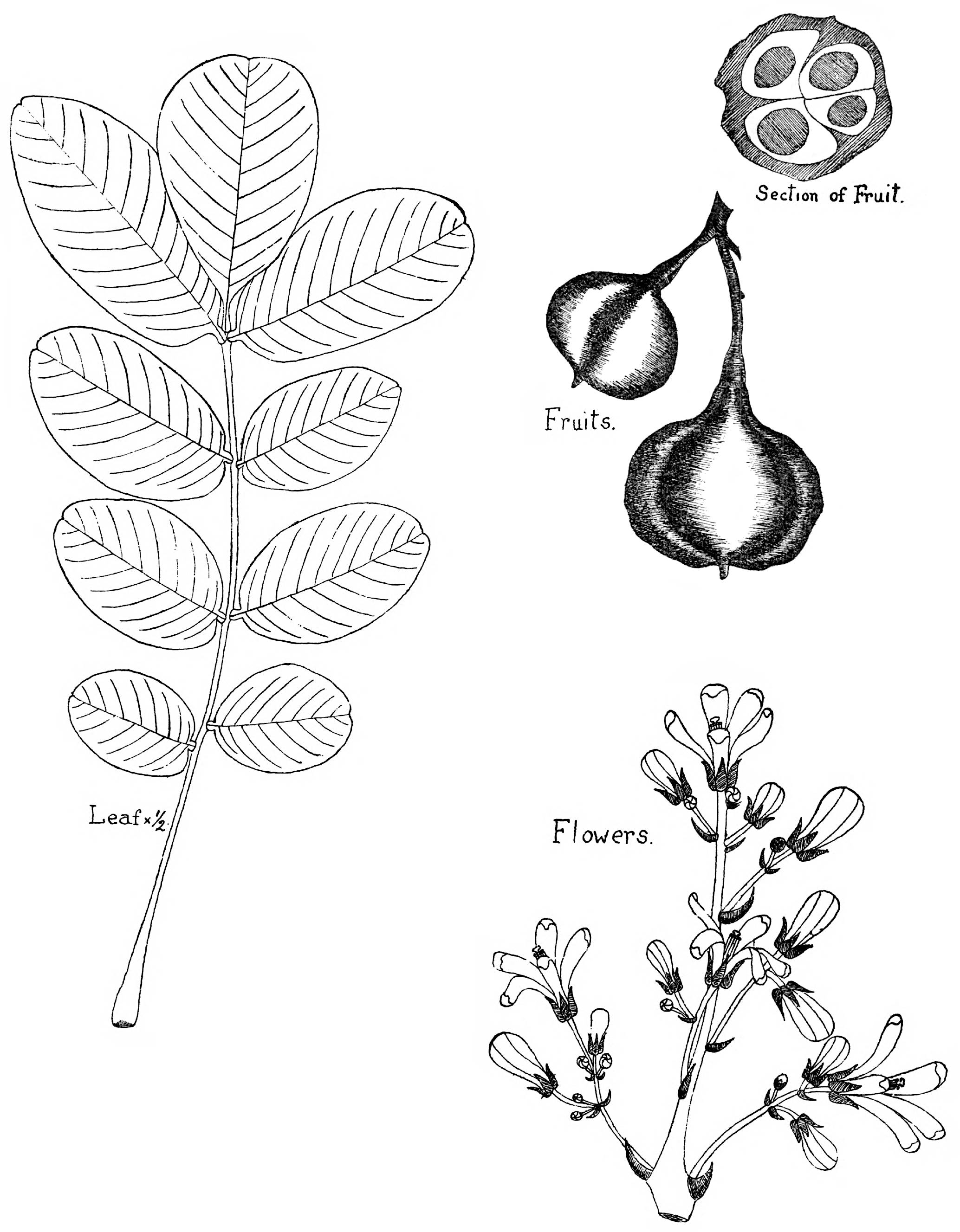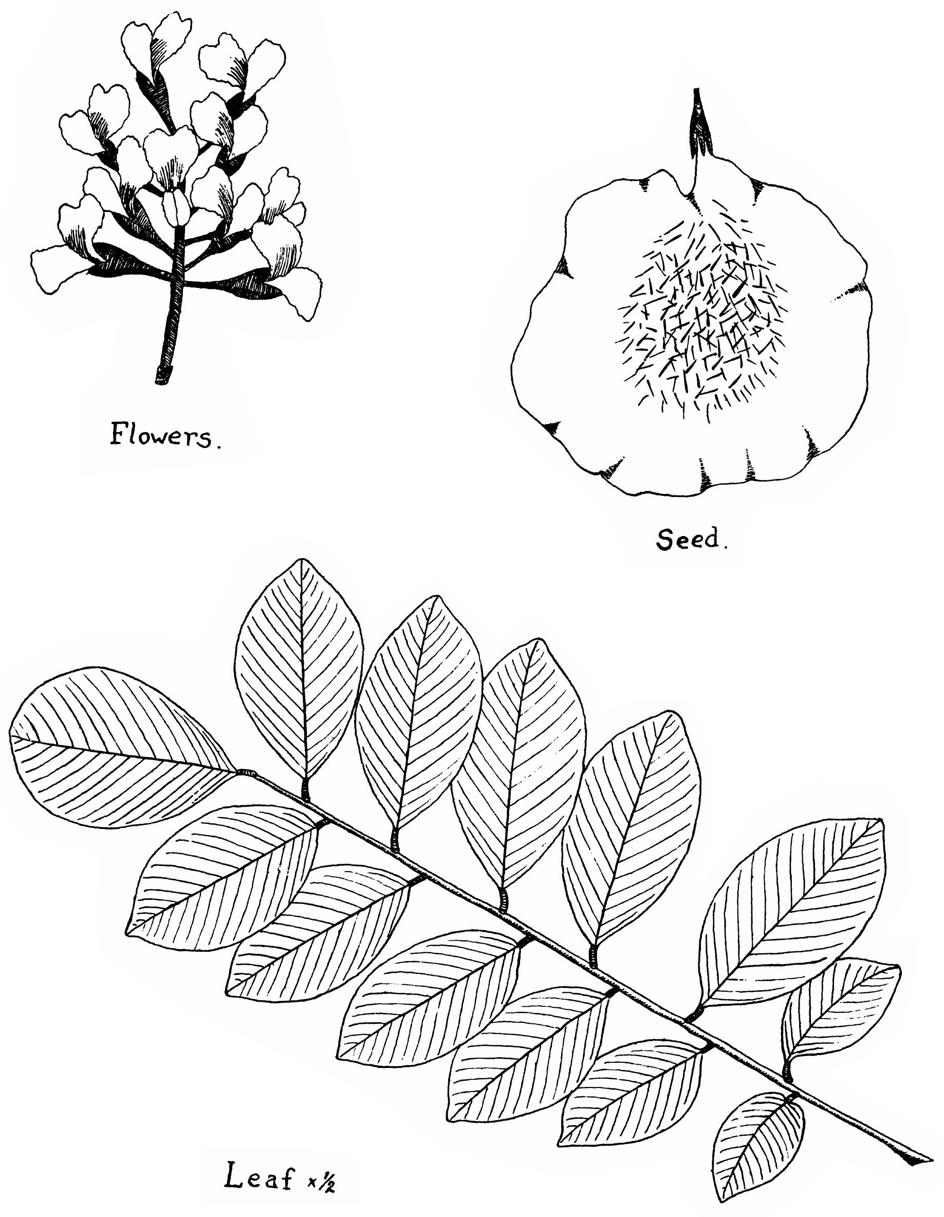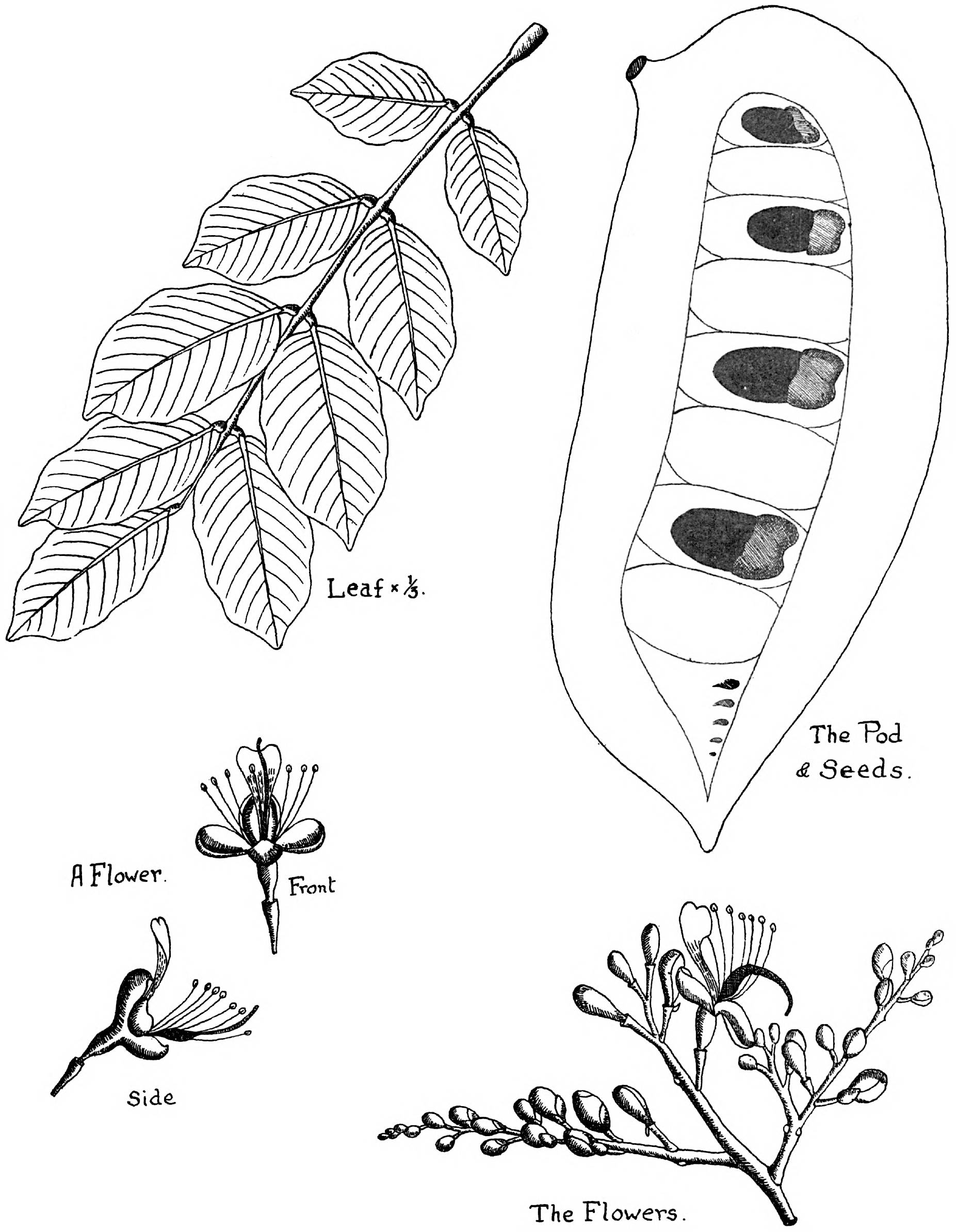 The Wood.—The heartwood is reddish with long, vertical streaks of black and brown in the pores. The sapwood is yellow with an orange grain. In transverse section the rings are indistinct, the pores are open and numerous, the soft tissue in wide and narrow festoons plainly visible to the unaided eye. The wood is hard, splits easily, is straight-grained, not easy to plane and weighs 65 lbs. a cubic foot.