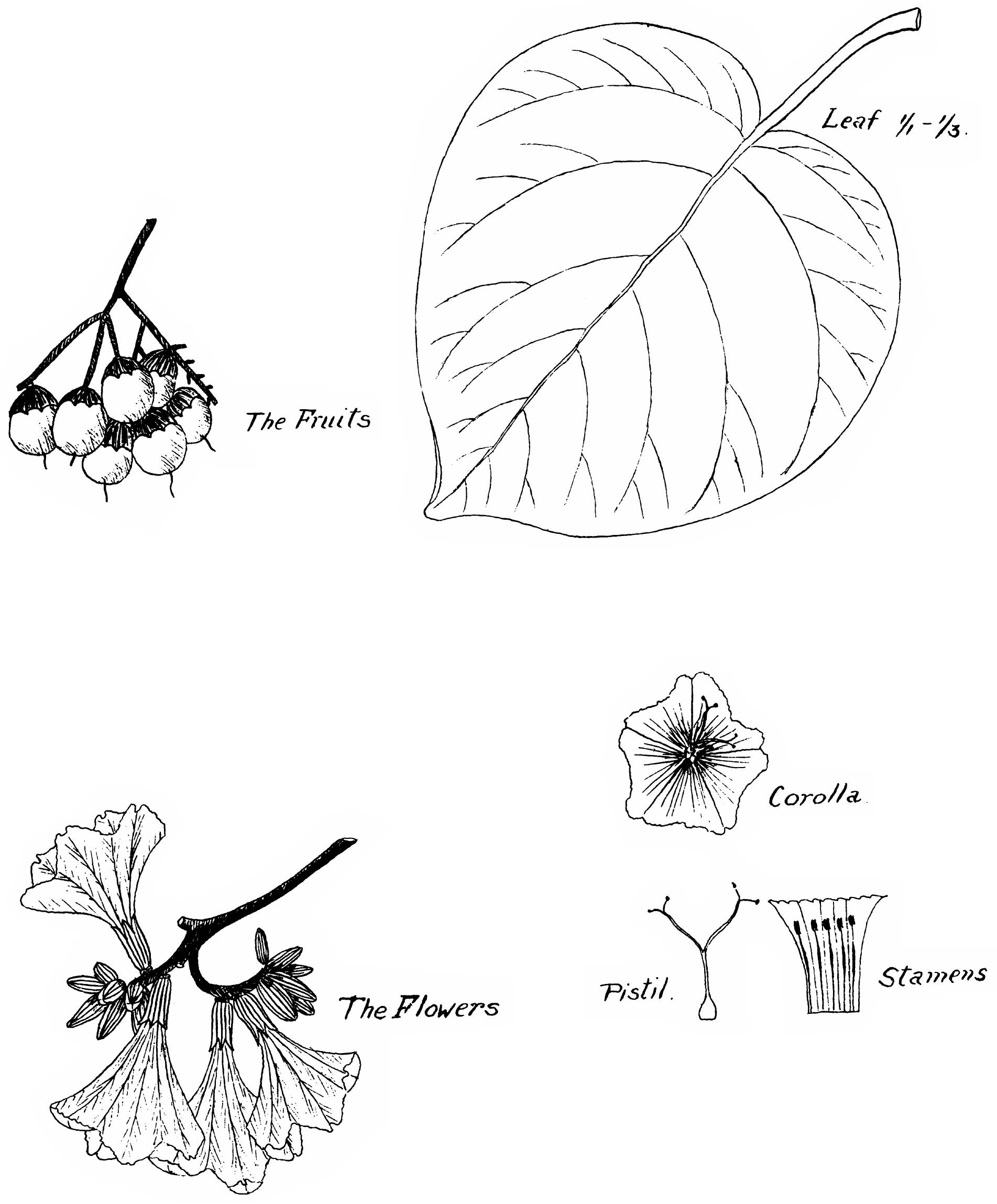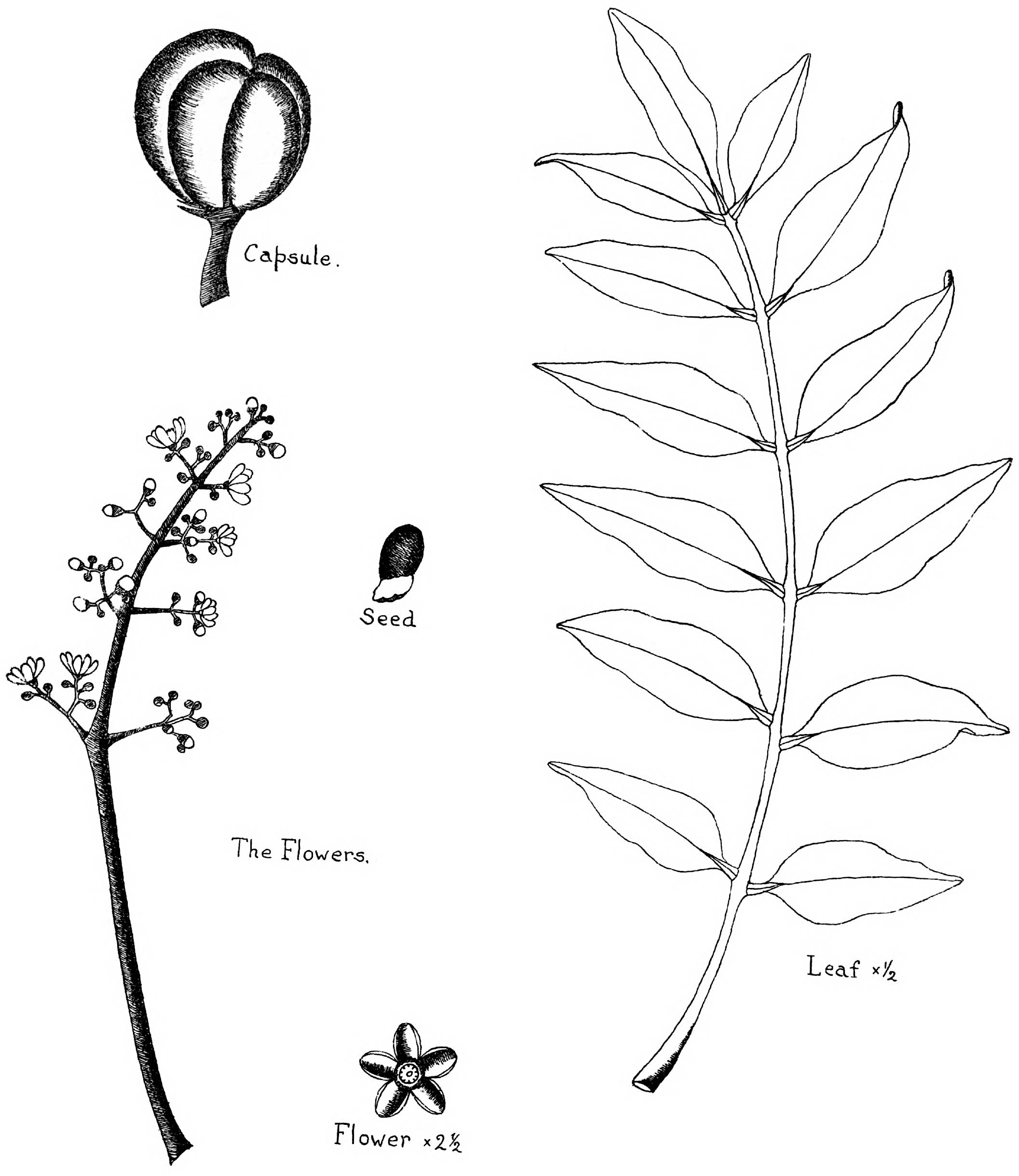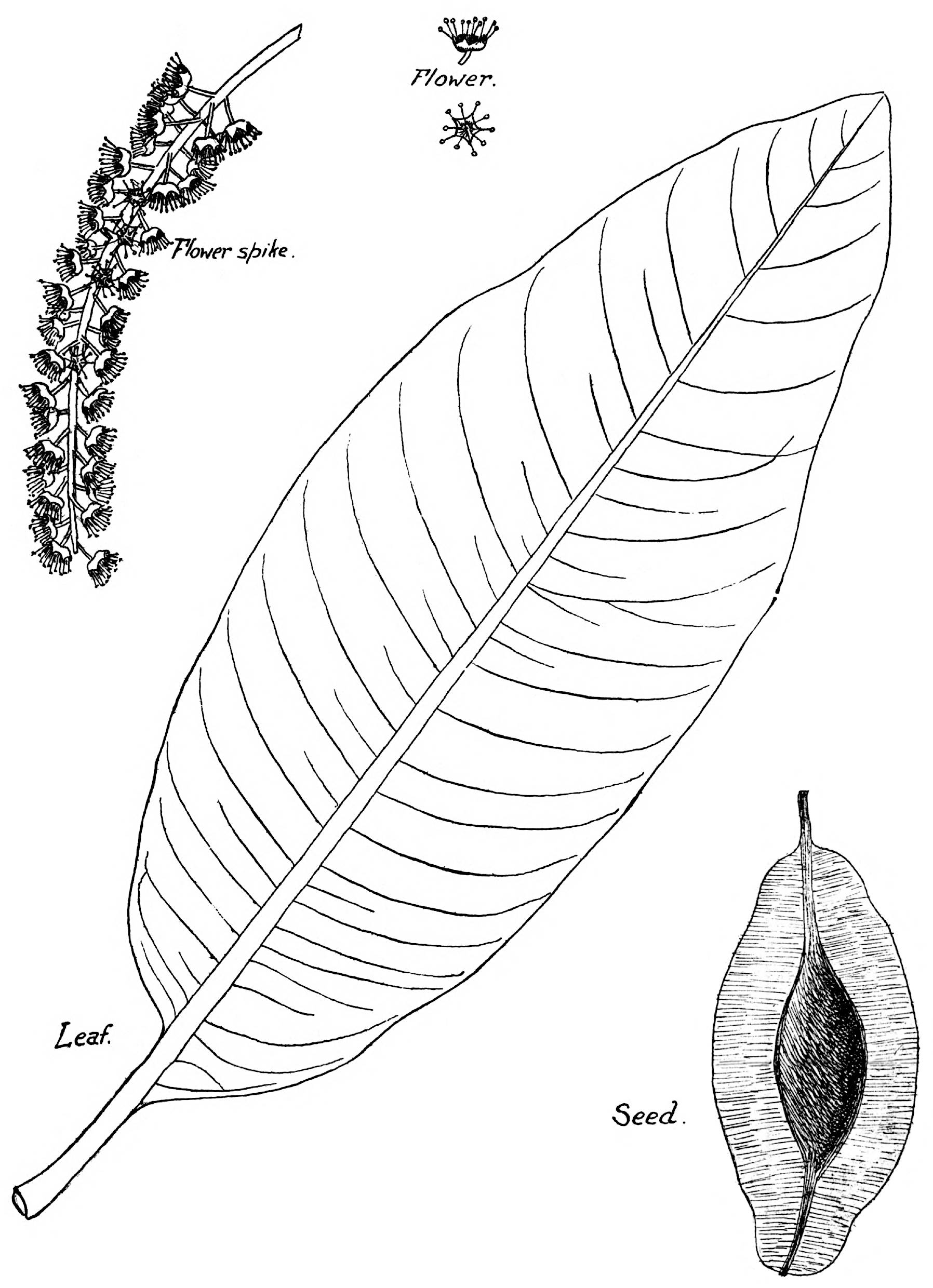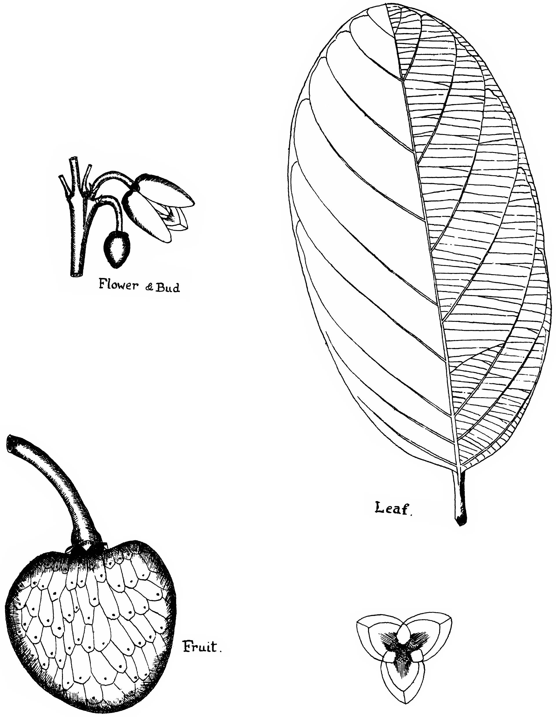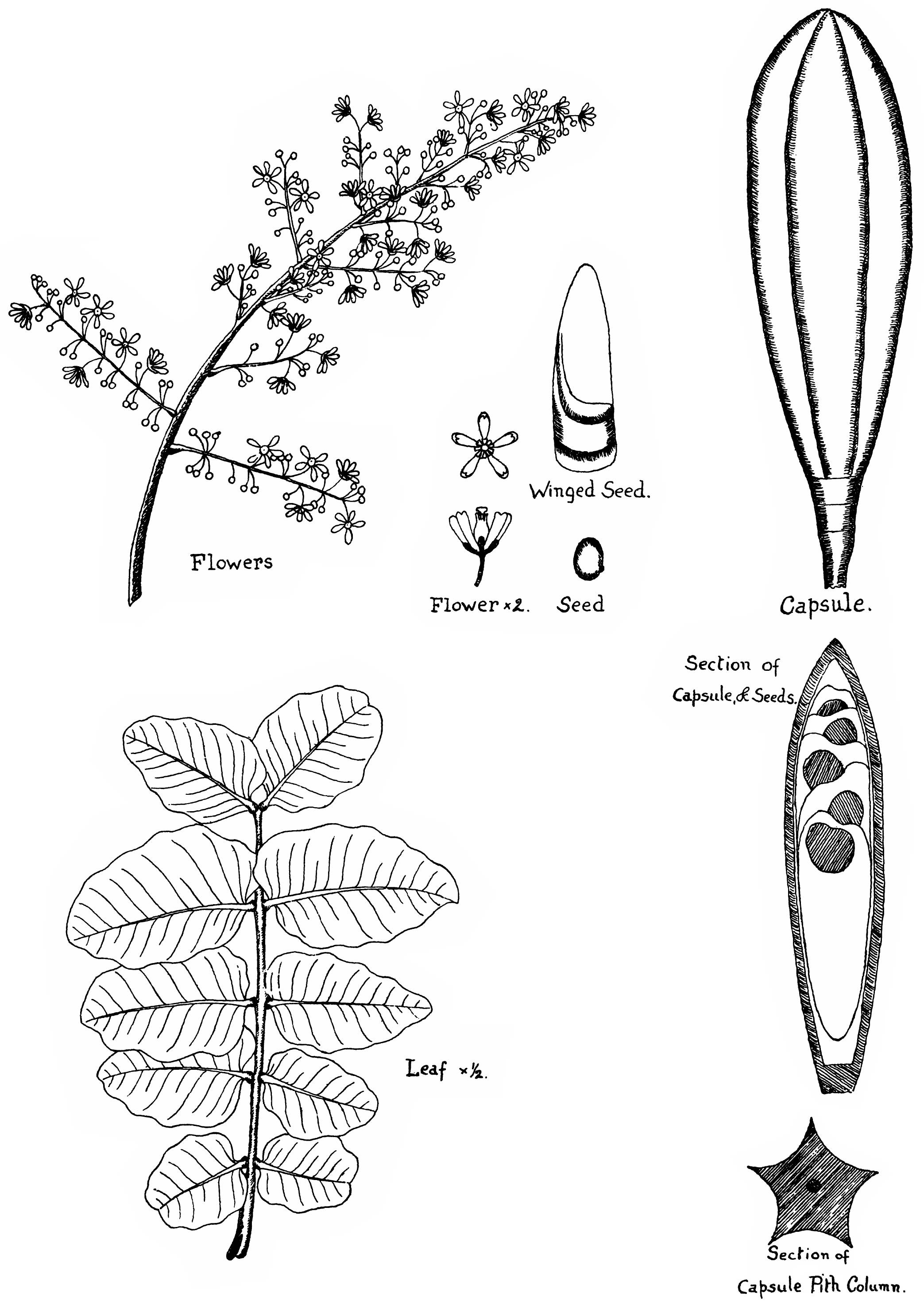 The Wood.—The heartwood is reddish with long, vertical streaks of black and brown in the pores. The sapwood is yellow with an orange grain. In transverse section the rings are indistinct, the pores are open and numerous, the soft tissue in wide and narrow festoons plainly visible to the unaided eye. The wood is hard, splits easily, is straight-grained, not easy to plane and weighs 65 lbs. a cubic foot.