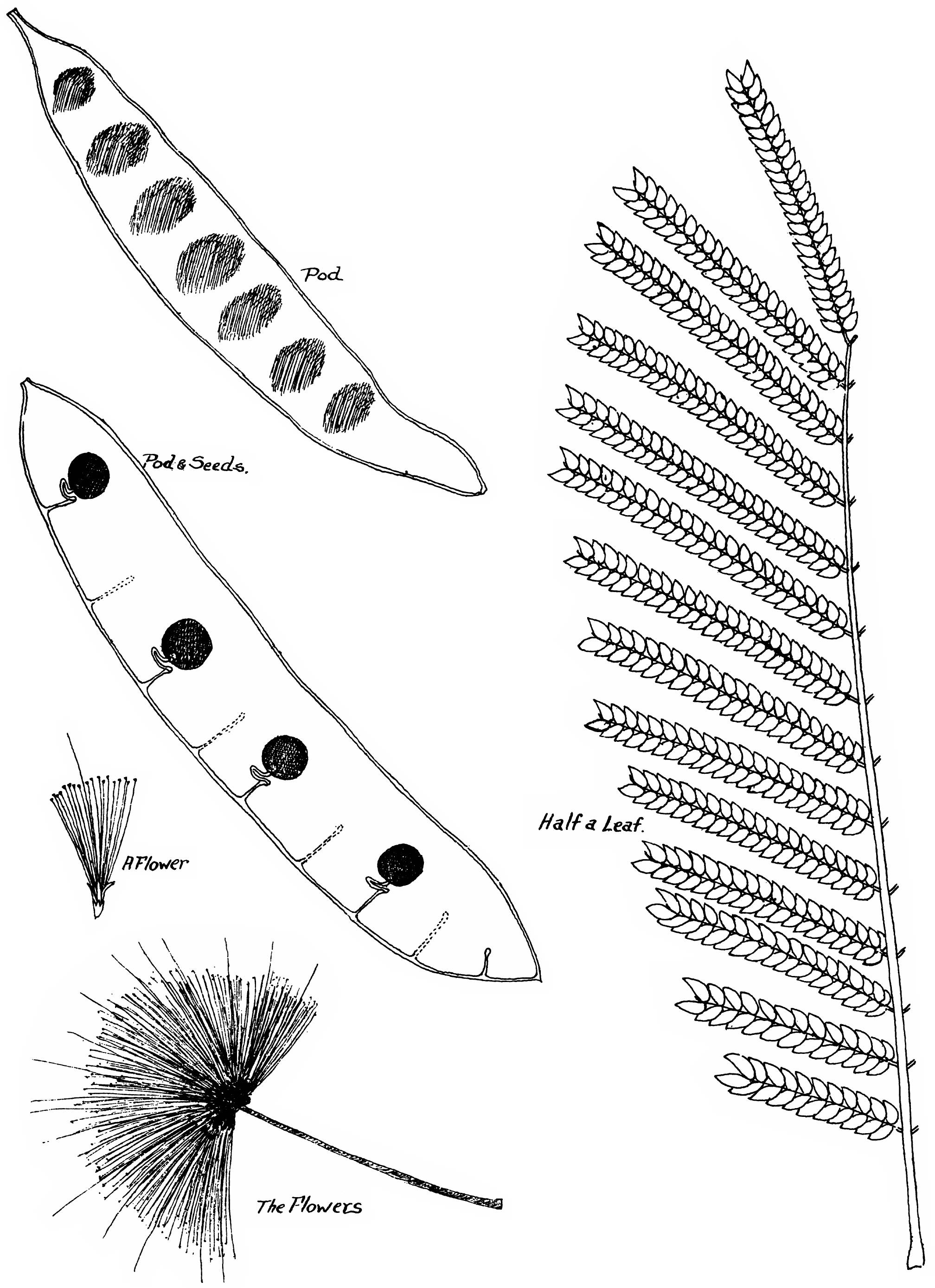 The Leaves are 12-18 inches long, bipinnate with 20 or more pairs of pinnae bearing 50 or more pairs of long, narrow, pointed leaflets with parallel edges. Near the base on the dorsal side of the stalk is a prominent oval gland. They are a very bright, fresh green, and at first erect, finally spread and droop.