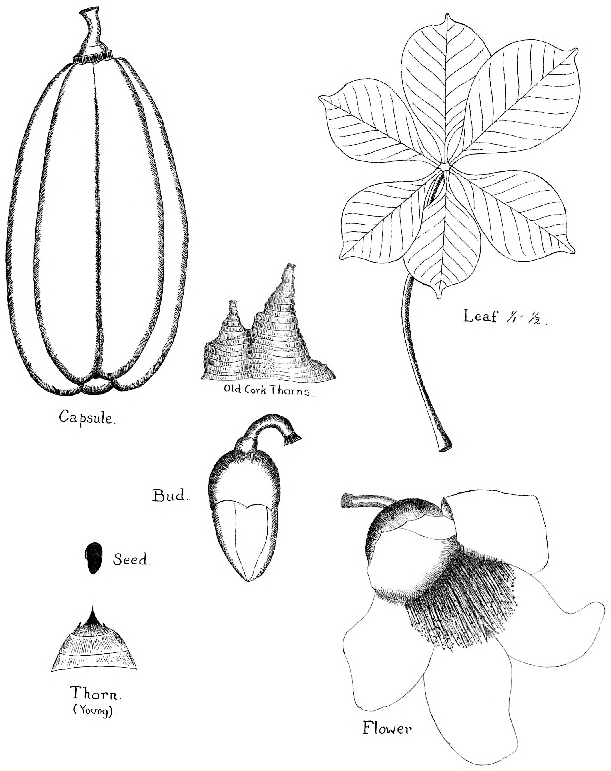The Thorns are in pairs, under ½ inch long and slightly recurved. They are pale brown with white bases. The young tree is armed all over, but as the tree ages the thorns leave the stem and finally the higher branches are free as if protection seemed to be unnecessary at a height.
