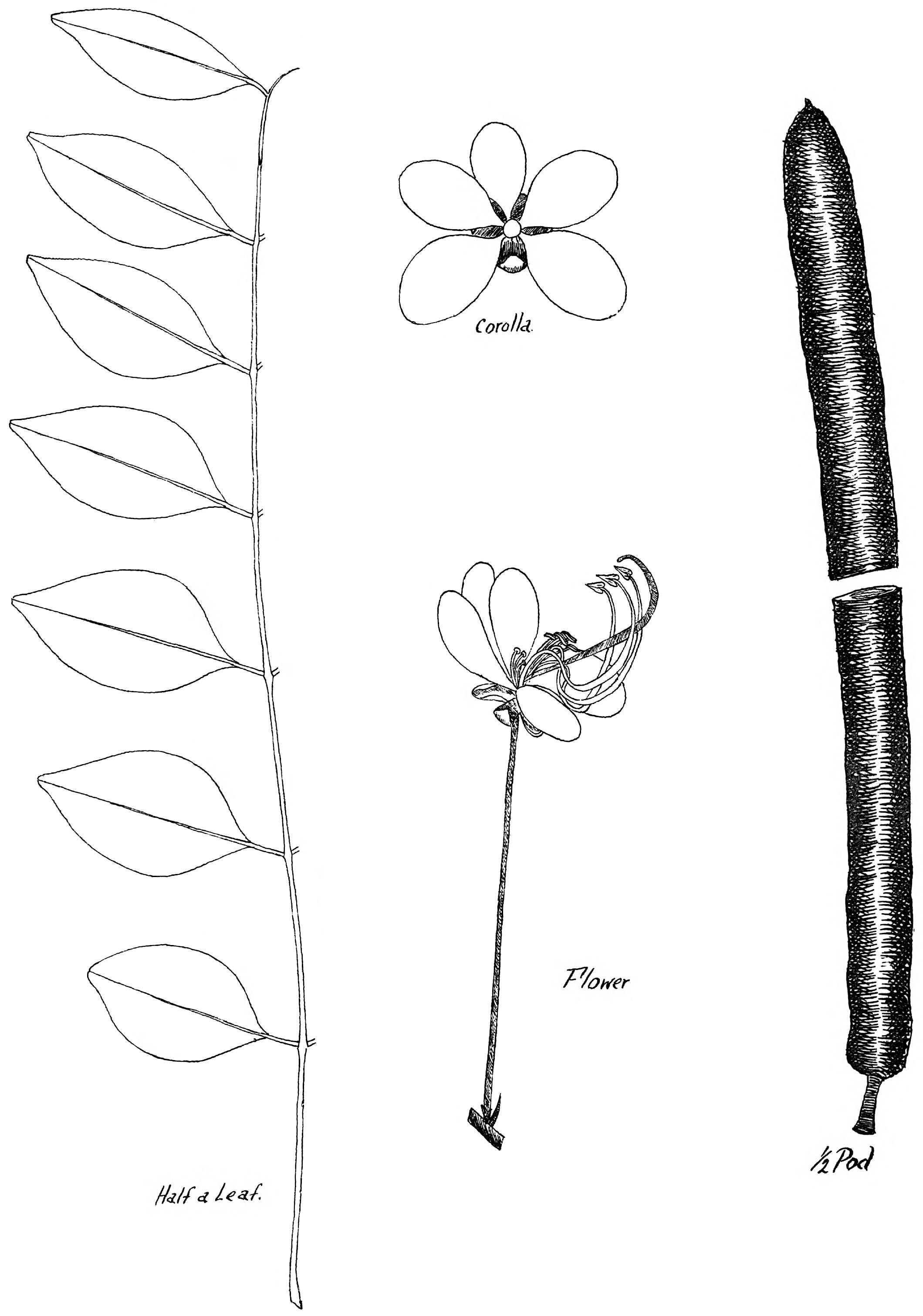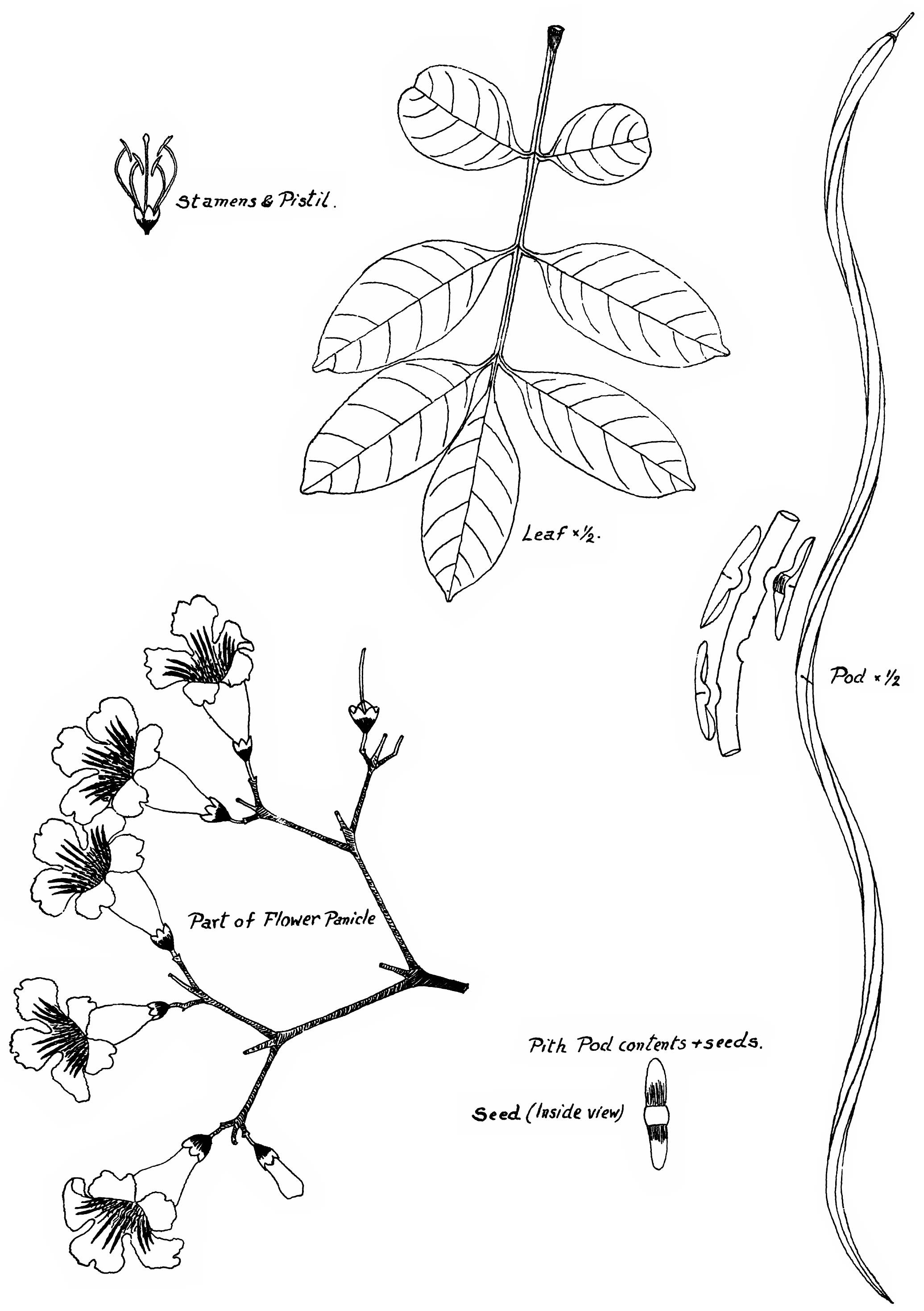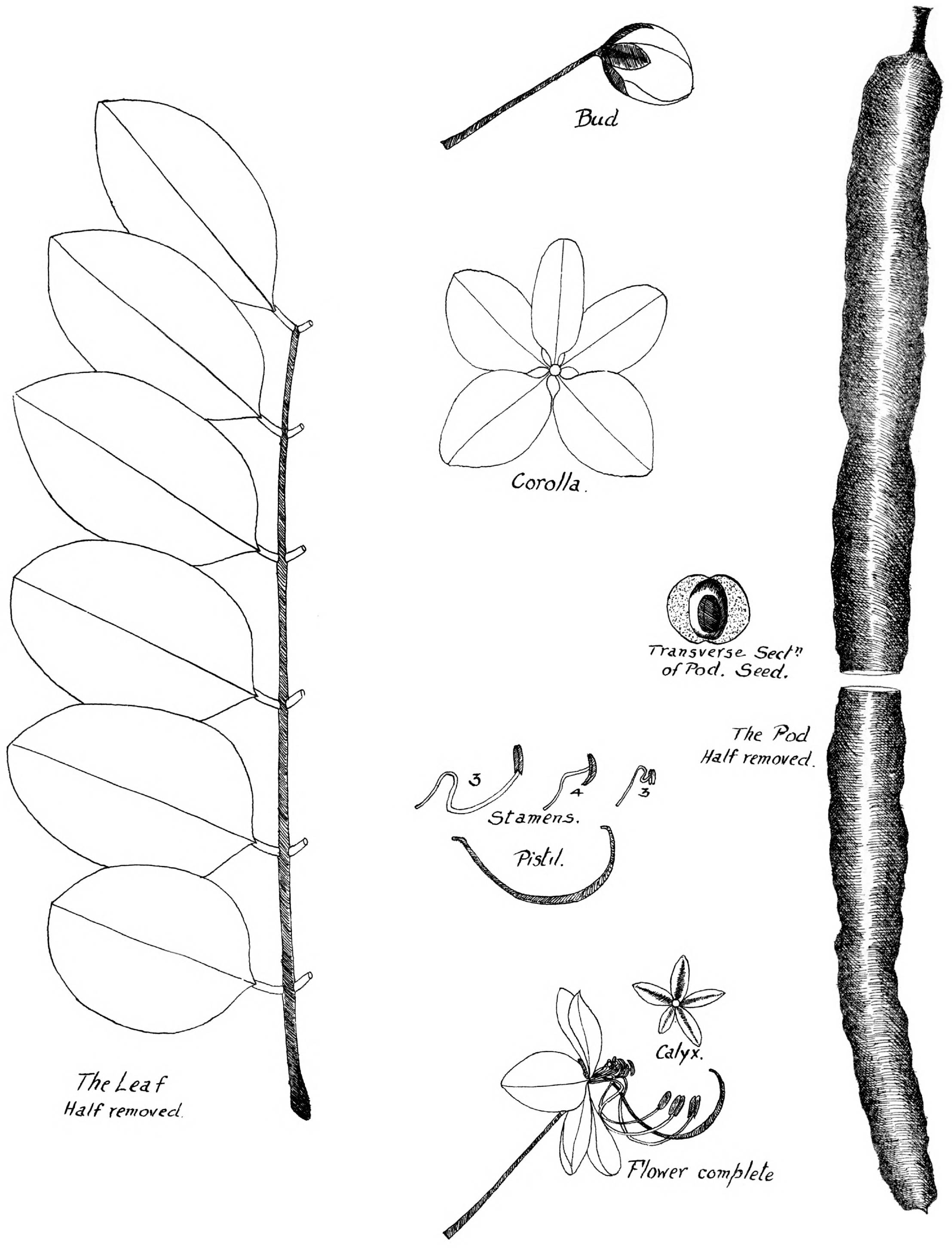 The Fruits are pods, at first green and sickle shaped, ripening to a bright orange and twisting into strange shapes. They are 4-6 inches long, 1 inch wide, concave on one side, convex on the other. They contain dark brown shiny seeds ⅜ inch long. The pods ripen in January and February and fall entire, rotting on the ground.